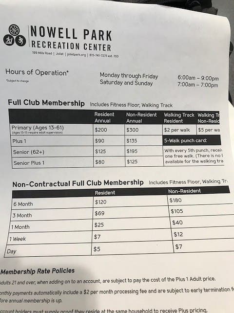 - Indoor walking track, 12 laps to a mile.