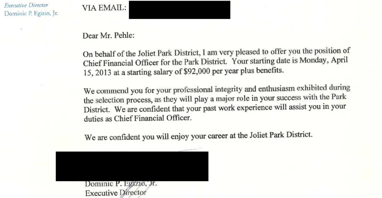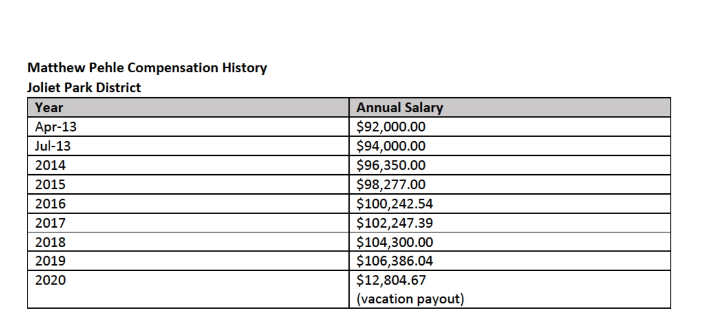 Pehle is 43 years old, according to his criminal charges. He was hired by the Joliet Park District 10 years ago, on March 27, 2013, by then-executive director Dominic Egizio Jr. Pehle's starting salary at the time of his hiring as the chief financial officer for the Joliet Park District was $92,000, plus the fringe benefits.