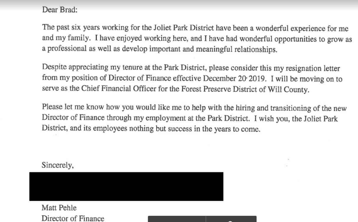 Pehle's employment at the forest preserve district ended several months after news of the criminal investigation involving the park district surfaced in the news.