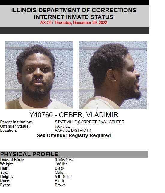 According to the state police registry, Vladimir Ceber is 35 years old, and he committed predatory criminal sexual assault in Cook County when he was 26 and his victim was 9 years old. The Illinois Department of Corrections website indicates Ceber was paroled from the Stateville Correctional Center north of Joliet in September.