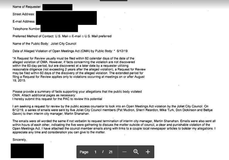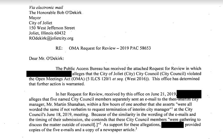 The name of the person lodging the complaint to the Office of Attorney General Kwame Raoul was redacted in the documents provided to Joliet Patch. However, Joliet resident Mary Beth Gannon spoke at Monday's special meeting and she told the council she was filing a complaint against the five elected city officials responsible for sending identical emails to Marty Shanahan on the same night, about 10 days earlier.