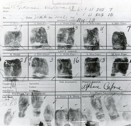 The following photo contains Al Capone's fingerprints when he was booked at the Joliet Police Department.