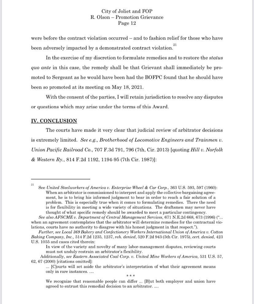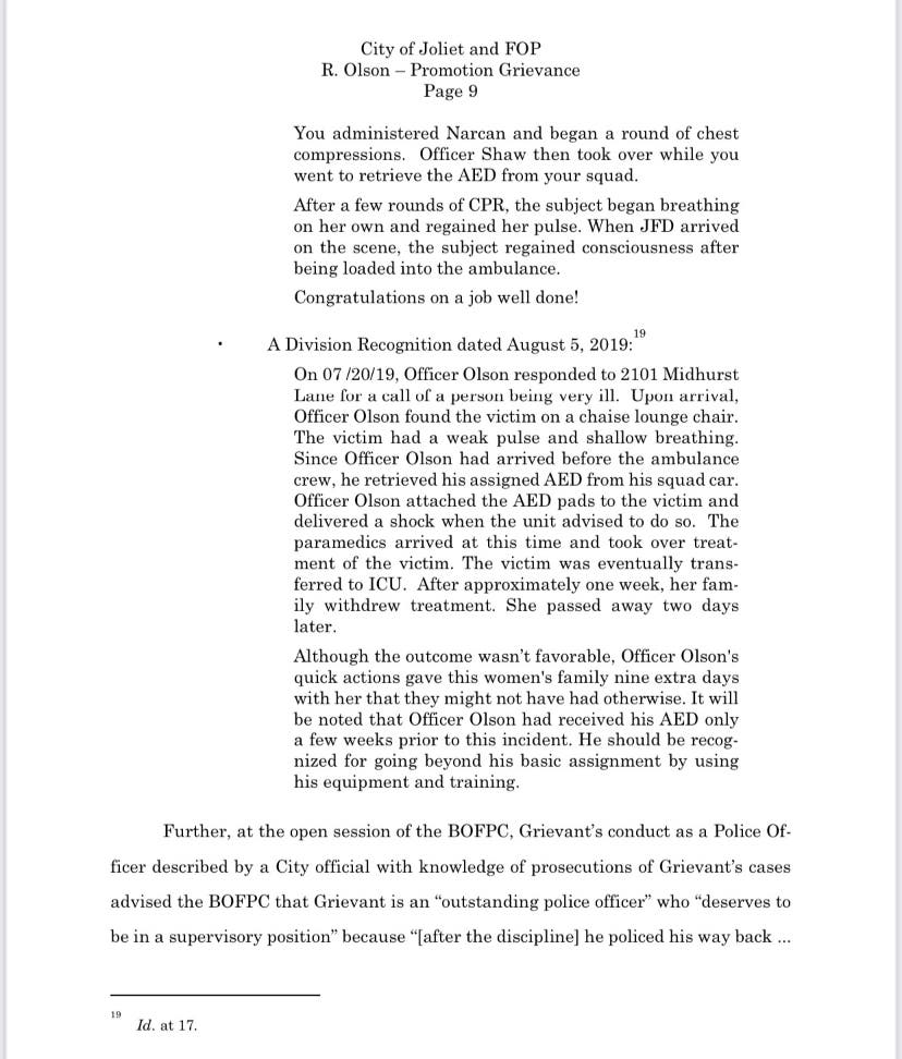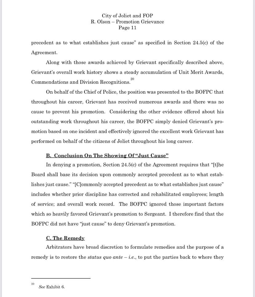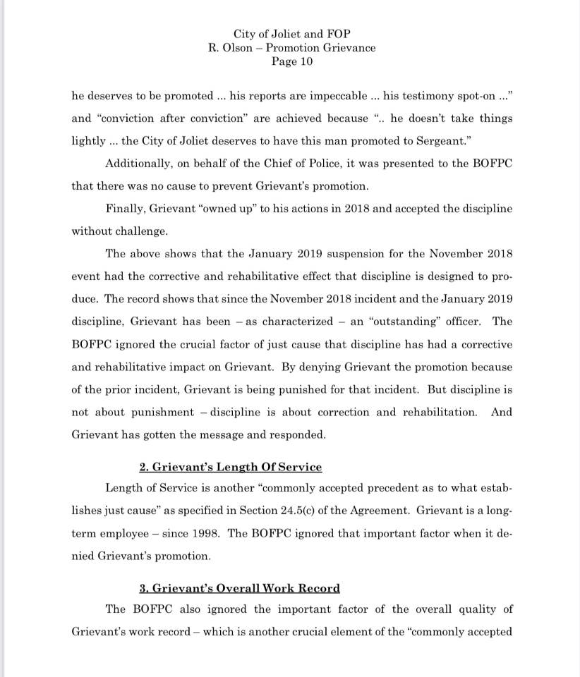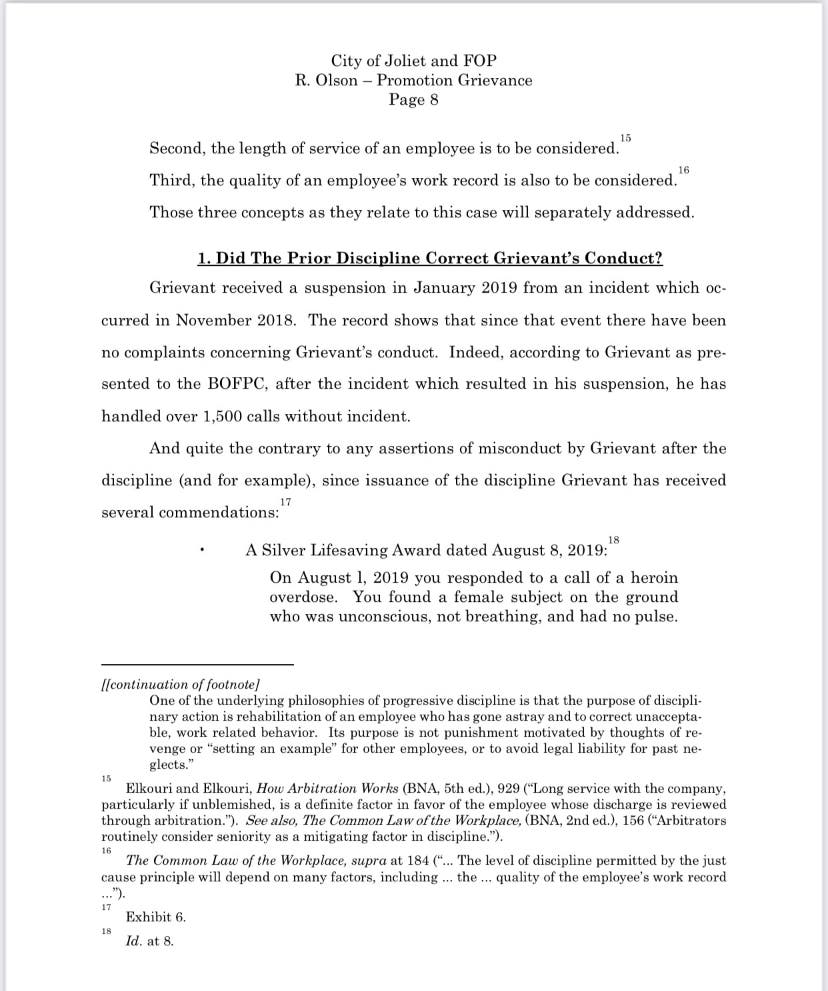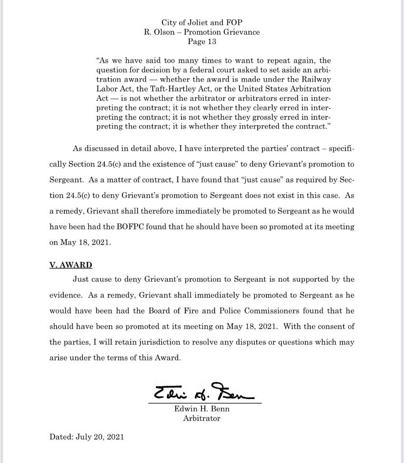 The following are the key documents from arbitrator Edwin Benn's decision to grant Officer Olson a promotion to sergeant, rejecting Joliet's police and fire board's denial: