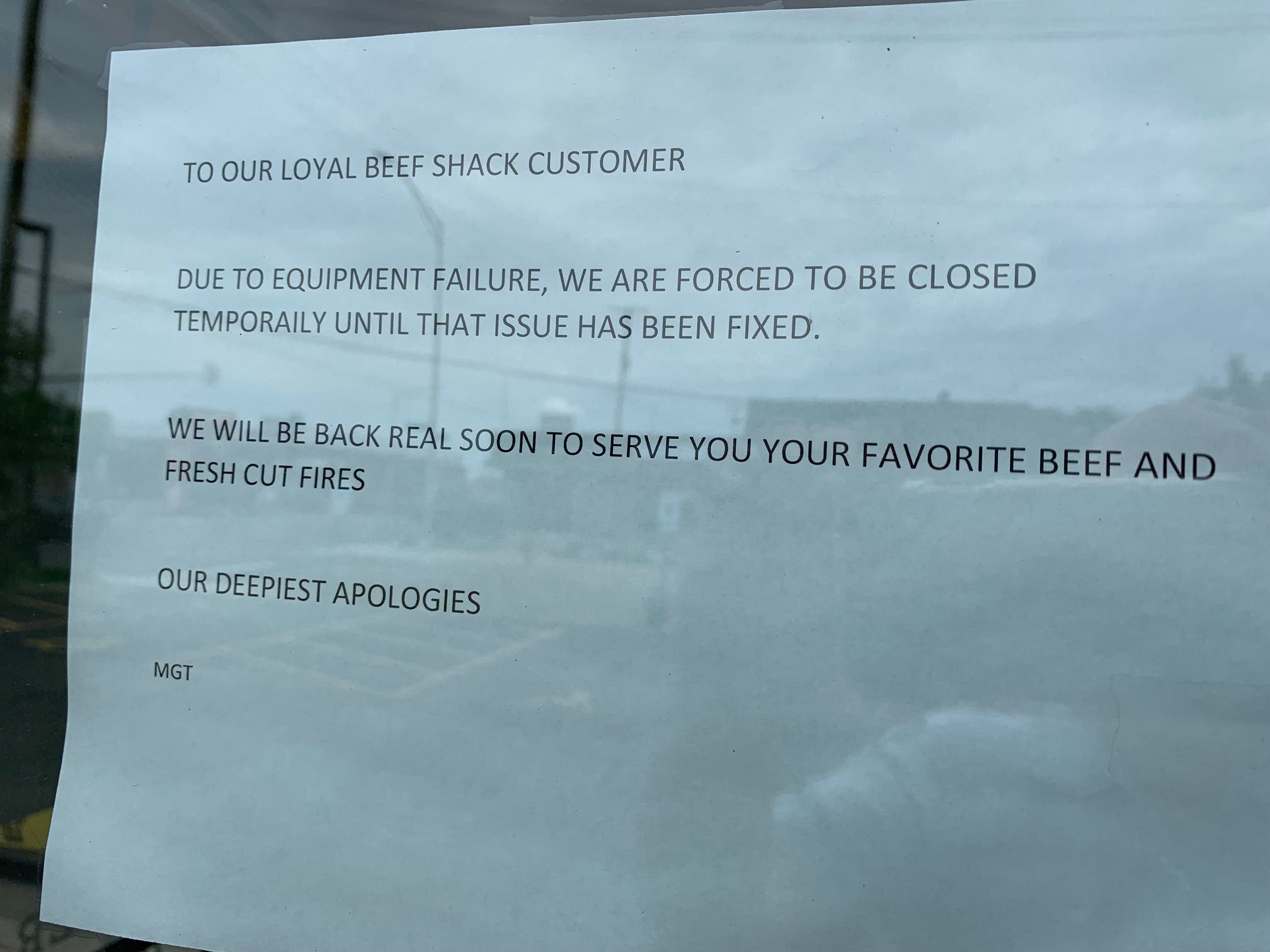 Joliet's Beef Shack at 1606 W. Jefferson St. put that sign on its windows in early March, stating "due to equipment failure, we are forced to be closed temporarily until that issue has been fixed."