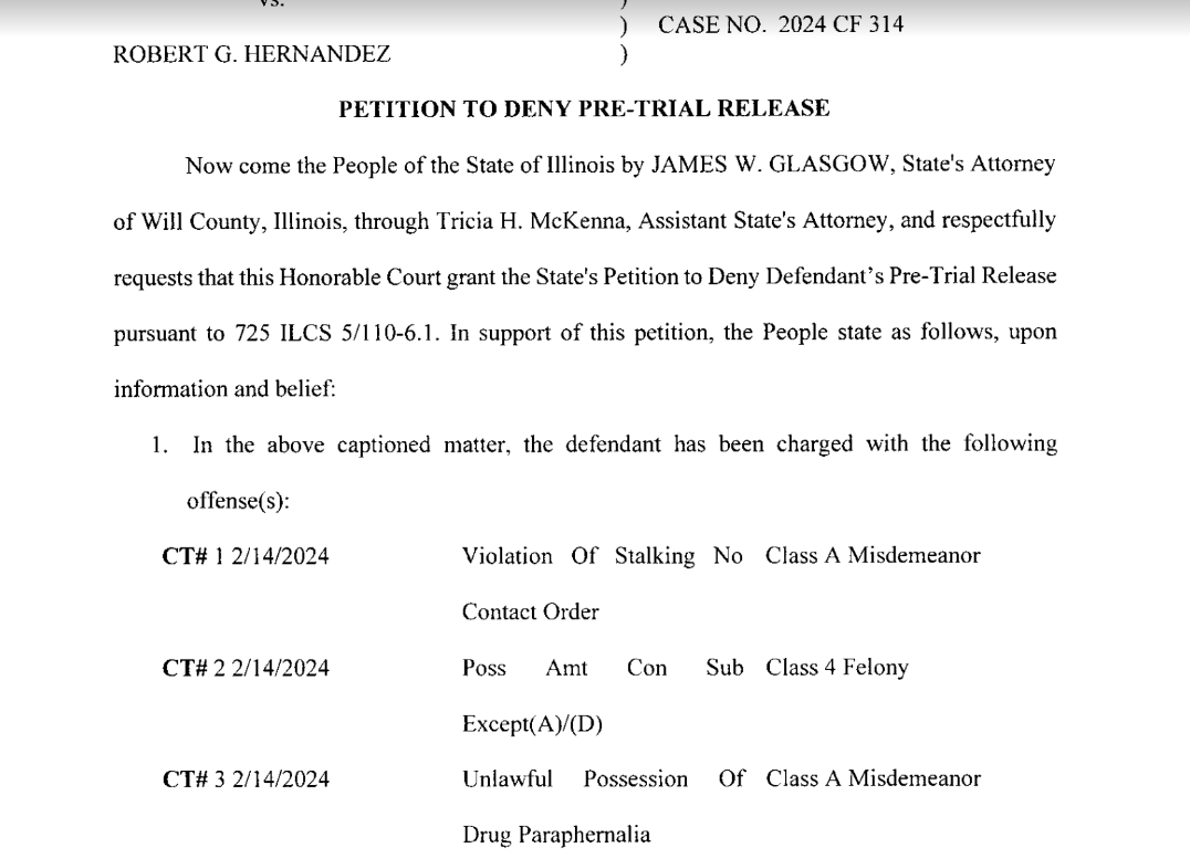 His charges include violation of a stalking no contact order, possession of a controlled substance and possession of drug paraphernalia. Hernandez also has a separate felony case of possession of a controlled substance stemming from his Friday night, Jan. 26 arrest by Joliet police in the Reedwood neighborhood following his work shift at the Walmart store on Jefferson Street.