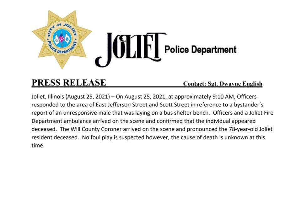 The Joliet Police Department issued a short news release indicating the senior citizen's death did not appear to show signs of foul play.