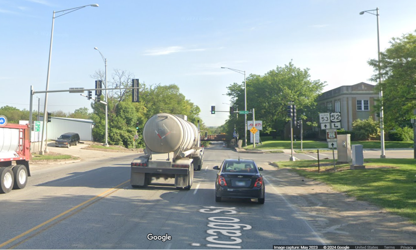 A white 2022 Kia Forte had heavy front end damage, and was smashed against the concrete wall on Chicago Street. The Kia was facing north in the southbound lanes of Route 53 and a black Chevy Tahoe was stopped in the curb lane of northbound Route 53, and it also had damage to the driver's side door and one of the tires.