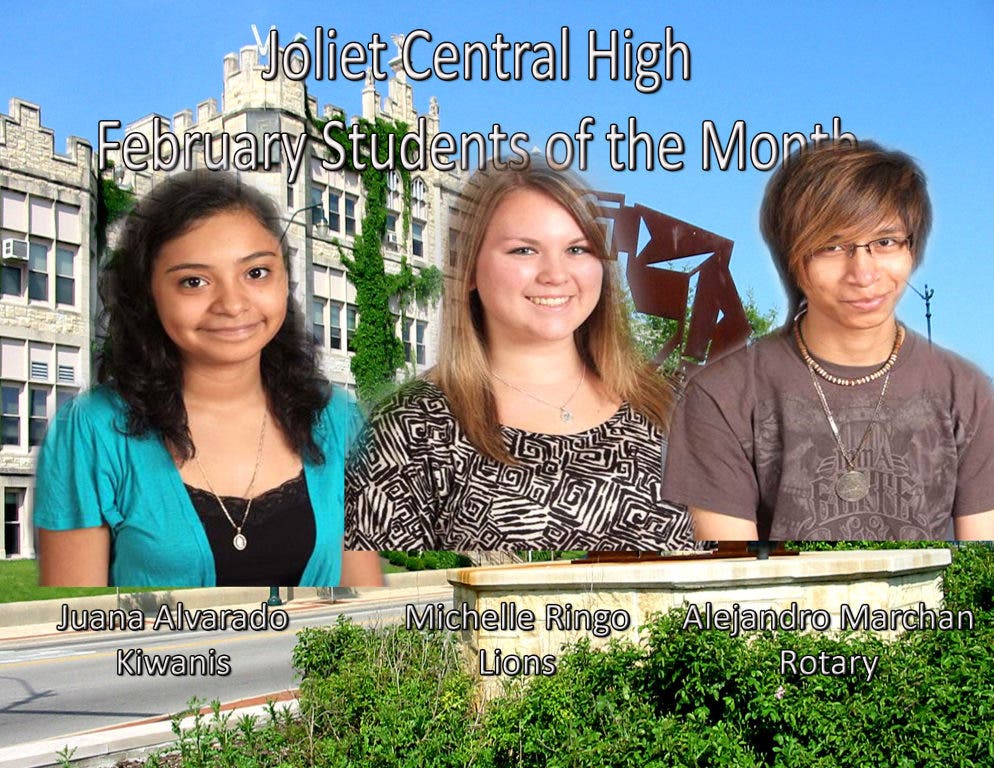 The Joliet Central High School Students of the Month for February are Juana Alvarado, Kiwanis Club; Alejandro Marchan, Rotary Club; and Michelle Ringo, Lions Club.