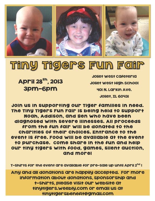 The Joliet West High School National Honor Society (NHS) is sponsoring the first ever Tiny Tigers Fun Fair on Sunday, April 28 from 3-6 p.m. at Joliet West. This fundraiser will honor Noah Galloy, Addison Locke and Ben Wisniewski, three children of JTHS staff members who have been diagnosed with severe illnesses.