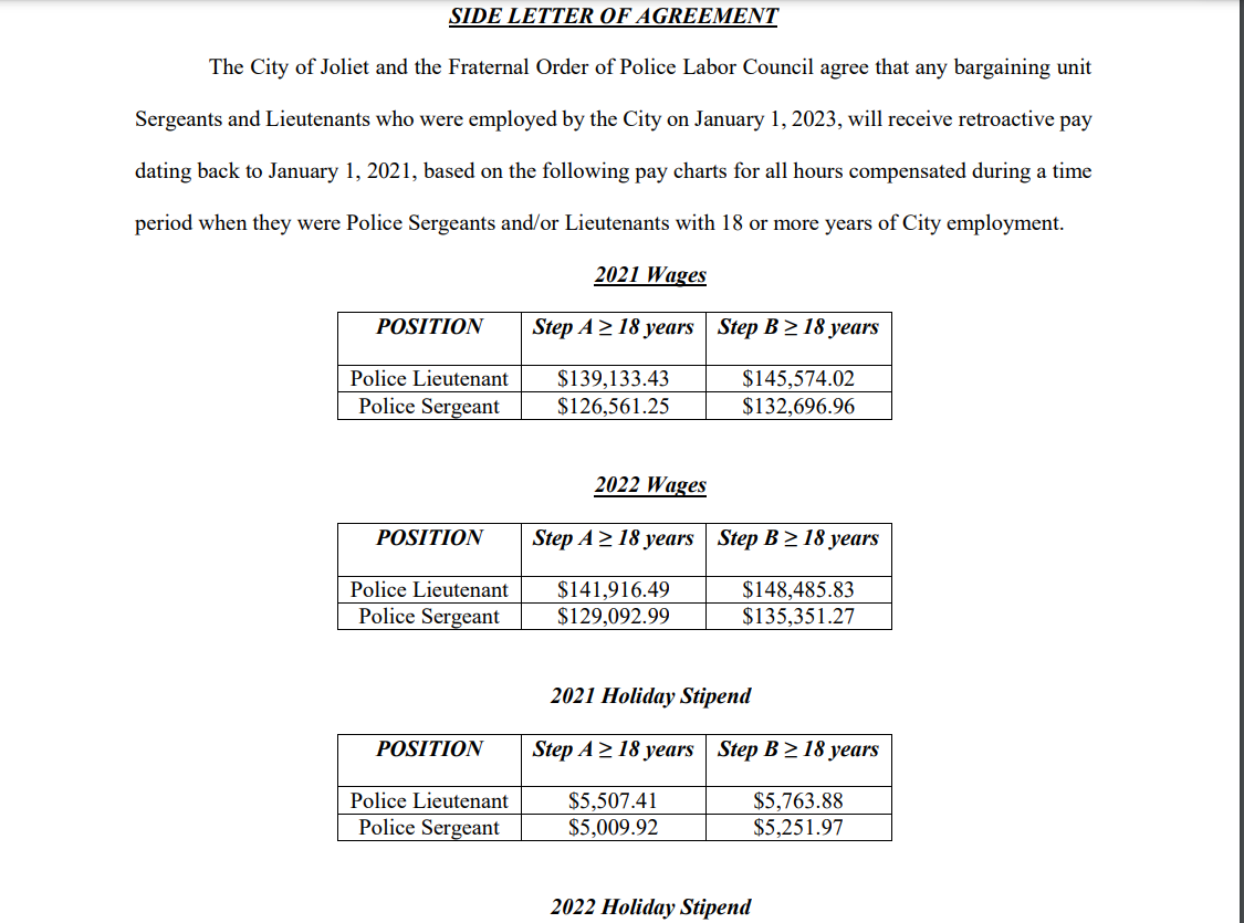 In addition to that, the Side Agreement calls for retroactive salary increases and holiday stipend pay adjustments going back to 2021 and 2022 — years when the Joliet Police Supervisors Association worked under a totally different contract.