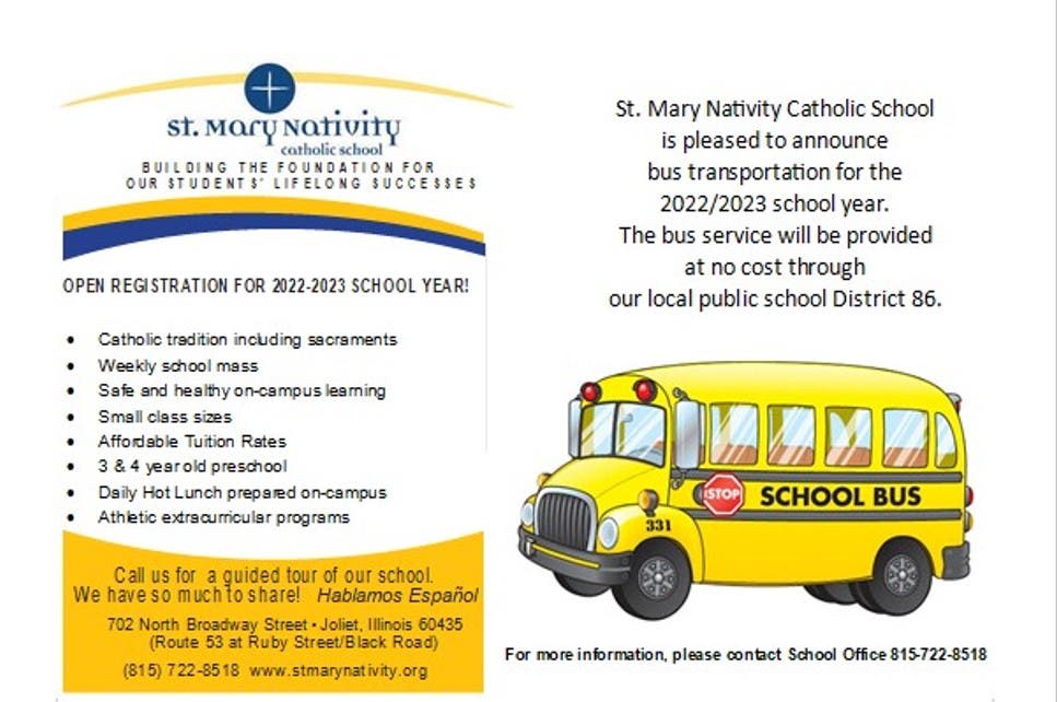 Open Enrollment for grades PS - 7th grade. For more info and a guided tour of our school 815-722-8518 jmartinez@stmarynativity.org