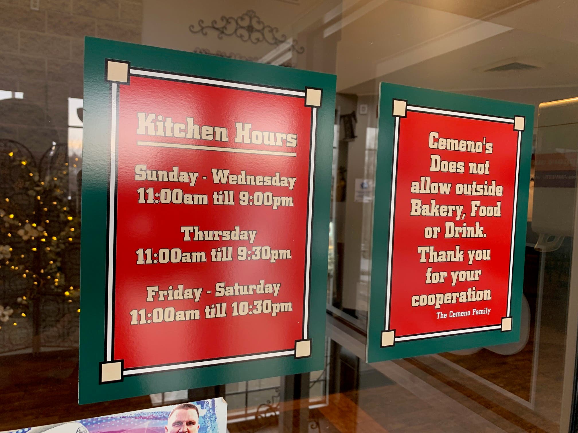 In recent months, in an effort to get more families into their dining room during weeknights, Cemeno's started offering a $29.99 Family Night special on Tuesdays only. For $29.99, customers get a large one topping pizza, breadsticks and a pitcher of pop.