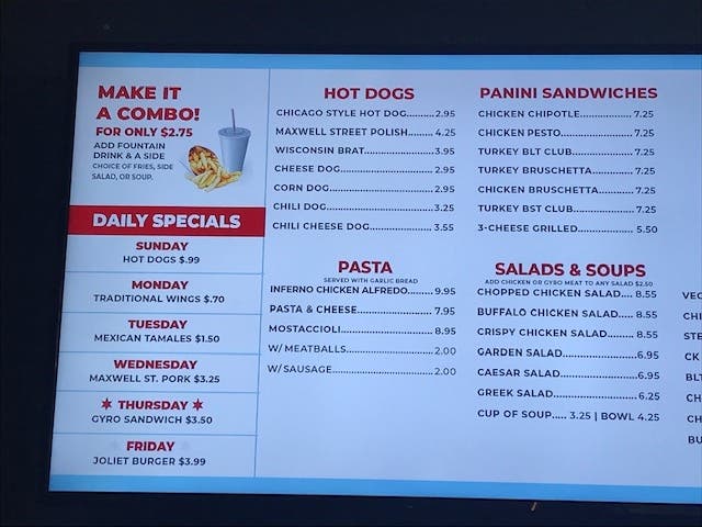Sunday sounds like the best special of all: all beef hotdogs for 99 cents. Among the other most popular daily specials are the Gyro Sandwich for $3.50 on Thursdays and the famous Joliet Burger for $3.99 on Fridays.
