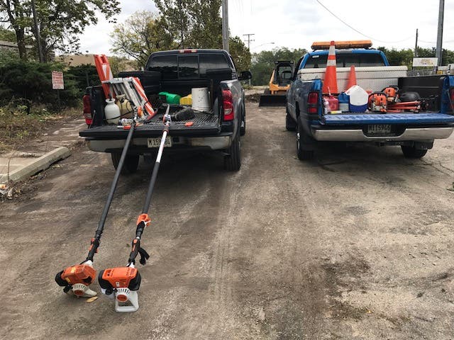 About 30 members of Joliet's public works division began around 6:30 a.m. Saturday equipped with wood chippers, weed trimmers and other machinery to wipe out the dense overgrowth. One of the city workers told Joliet Patch that crews planned to return on Sunday. Joliet Patch was on hand to capture several photos of Saturday's massive clean-up effort around the prison property.