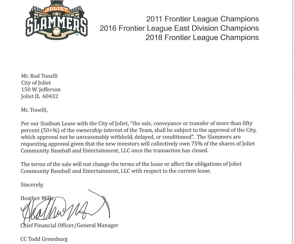 Joliet Patch contacted Heather Mills, general manager and chief financial officer with the Joliet Slammers on Wednesday, and she called back saying she cannot disclose any names of possible owners at this time. However, Mills did confirm the Joliet City Council stadium committee is meeting next week to review the potential sale of more than 50 percent of the ownership rights of the Joliet Slammers.