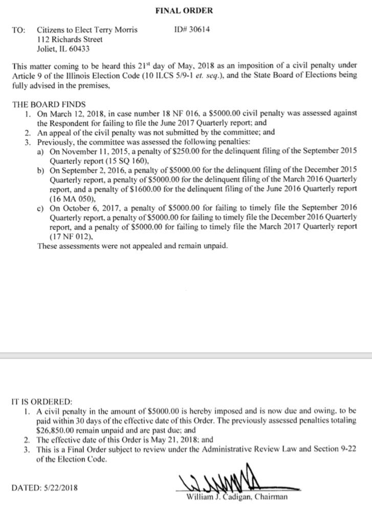 On July 18, the state election board issued a fine of $31,850 against the Citzens To Elect Terry Morris, a political fund-raising committee that the state has since shut down. Over the past few years, Morris' committee was consistently delinquent in its filing of the east-side councilman's campaign disclosure reports to the state of Illinois, public documents show.