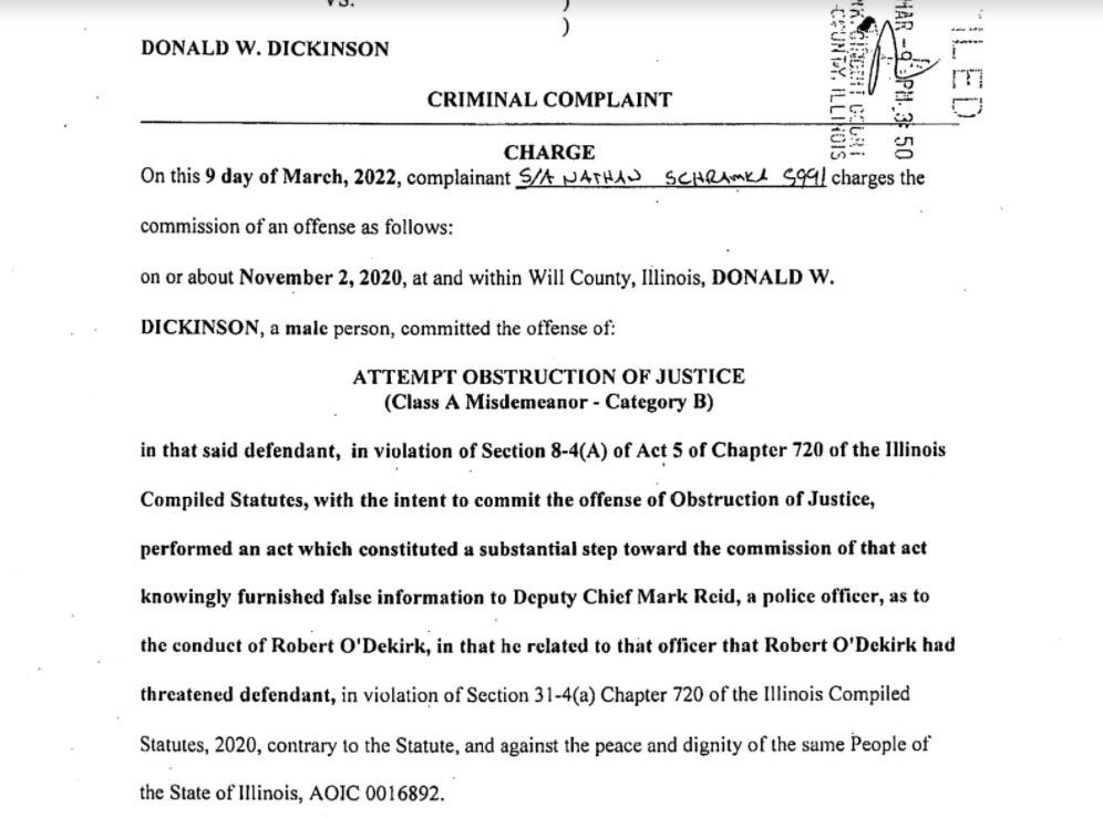 In November 2020, Patch reported that Dickinson filed a Joliet police report against Mayor Bob O'Dekirk. The mayor later told Patch he may be filing a police report of his own accusing Dickinson of filing a false police report surrounding the matter.