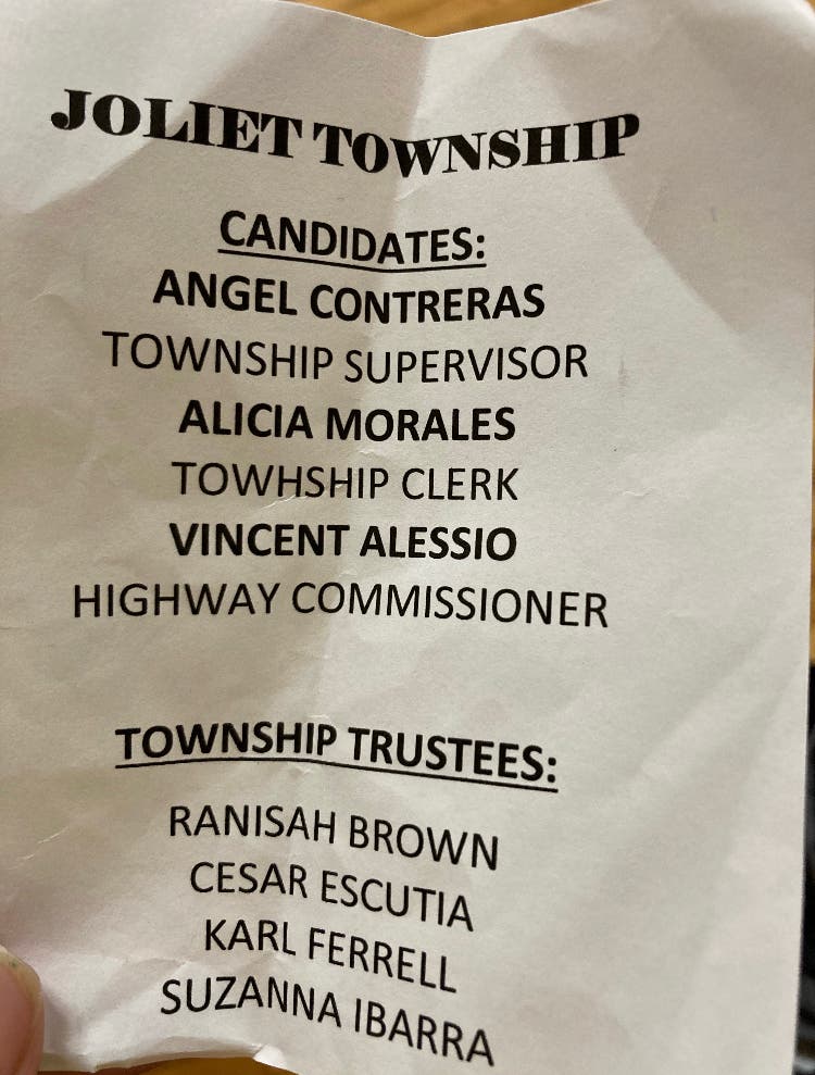 As a result of Tuesday night's caucus vote, Contreras will be the Democrat candidate for Joliet Township Supervisor, Alicia Morales will be the candidate for township clerk and Vince Alessio, a candidate who lost in the 2019 Joliet City Council election to Pat Mudron, will be the candidate for Joliet Township highway commissioner.