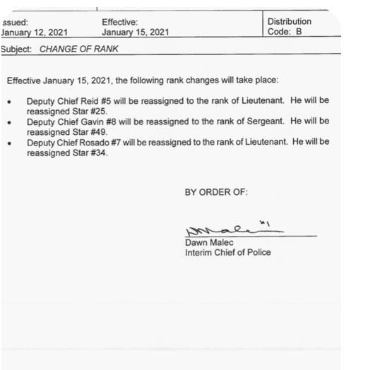 But things did not work out for Gavin in his new role, and Malec, the city's new chief, wanted Gavin to have no part of her upper command staff moving forward in 2021.