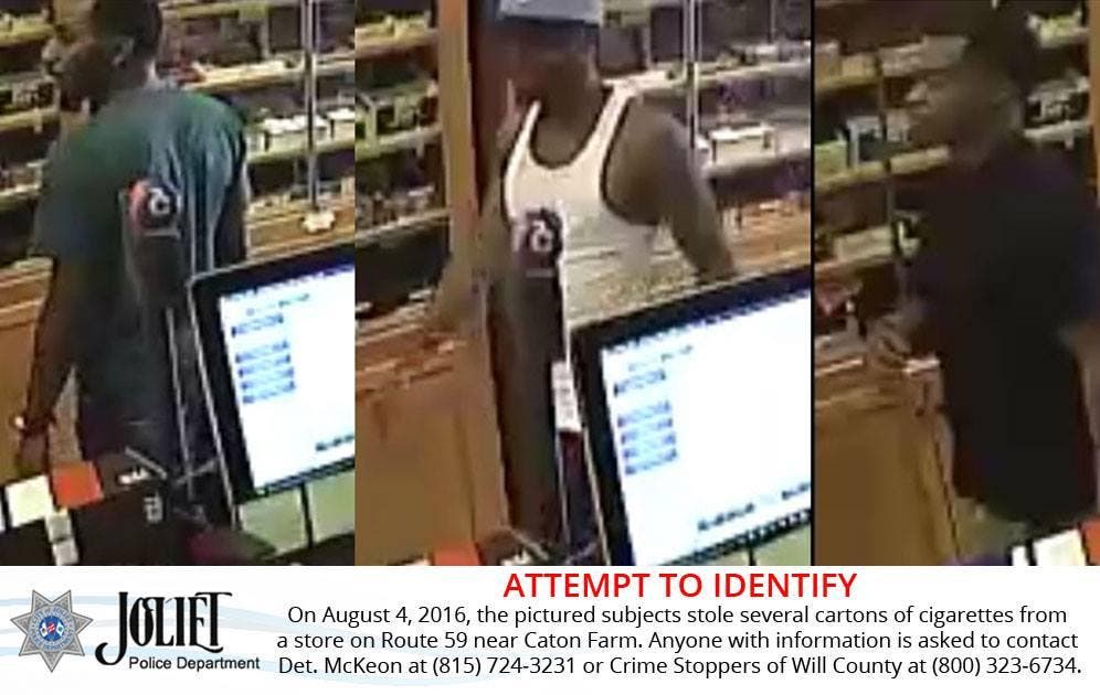 JOLIET, IL — The Joliet Police Department is looking for the identities of three men who allegedly stole several cartons of cigarettes from a store on Route 59 near Caton Farm Road on Aug. 4.