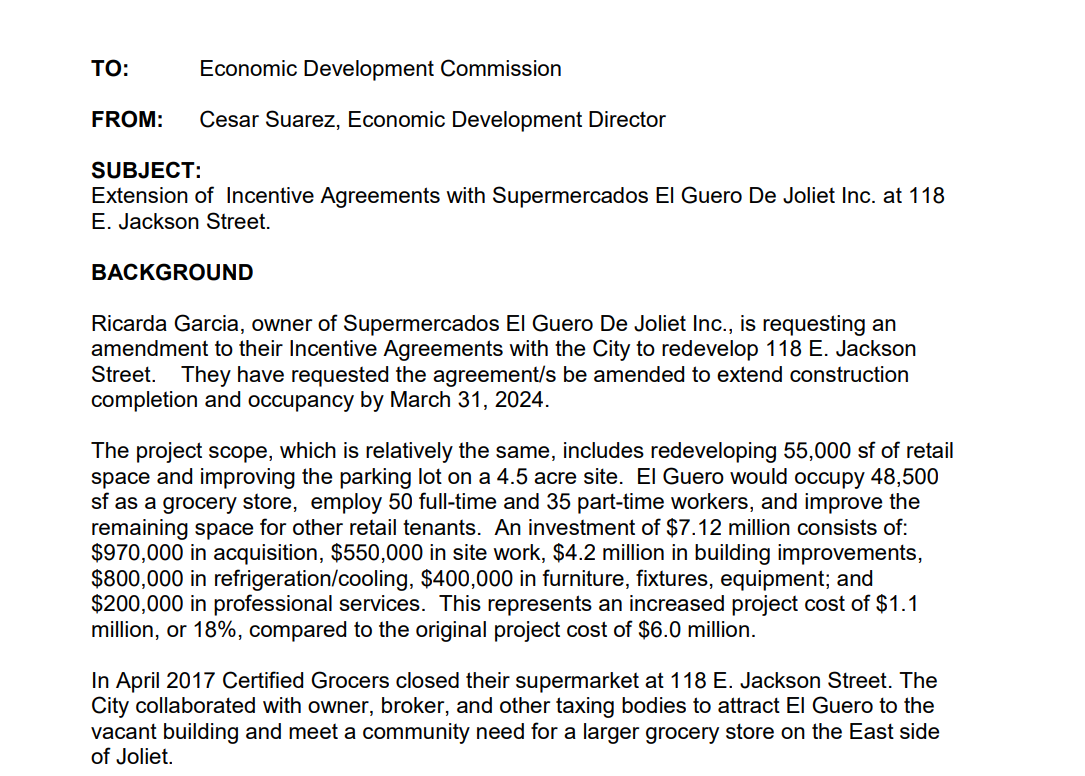 At 4 p.m. Wednesday, Joliet's current economic development director Cesar Suarez will ask the economic development committee to update the tax incentives for El Guero — with an expectation that El Guero will actually be open by April 1, 2024.