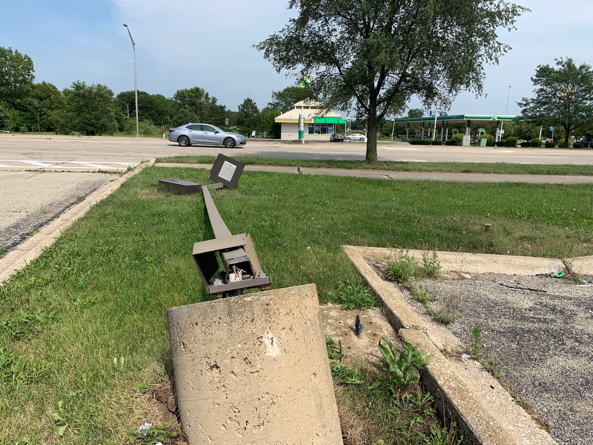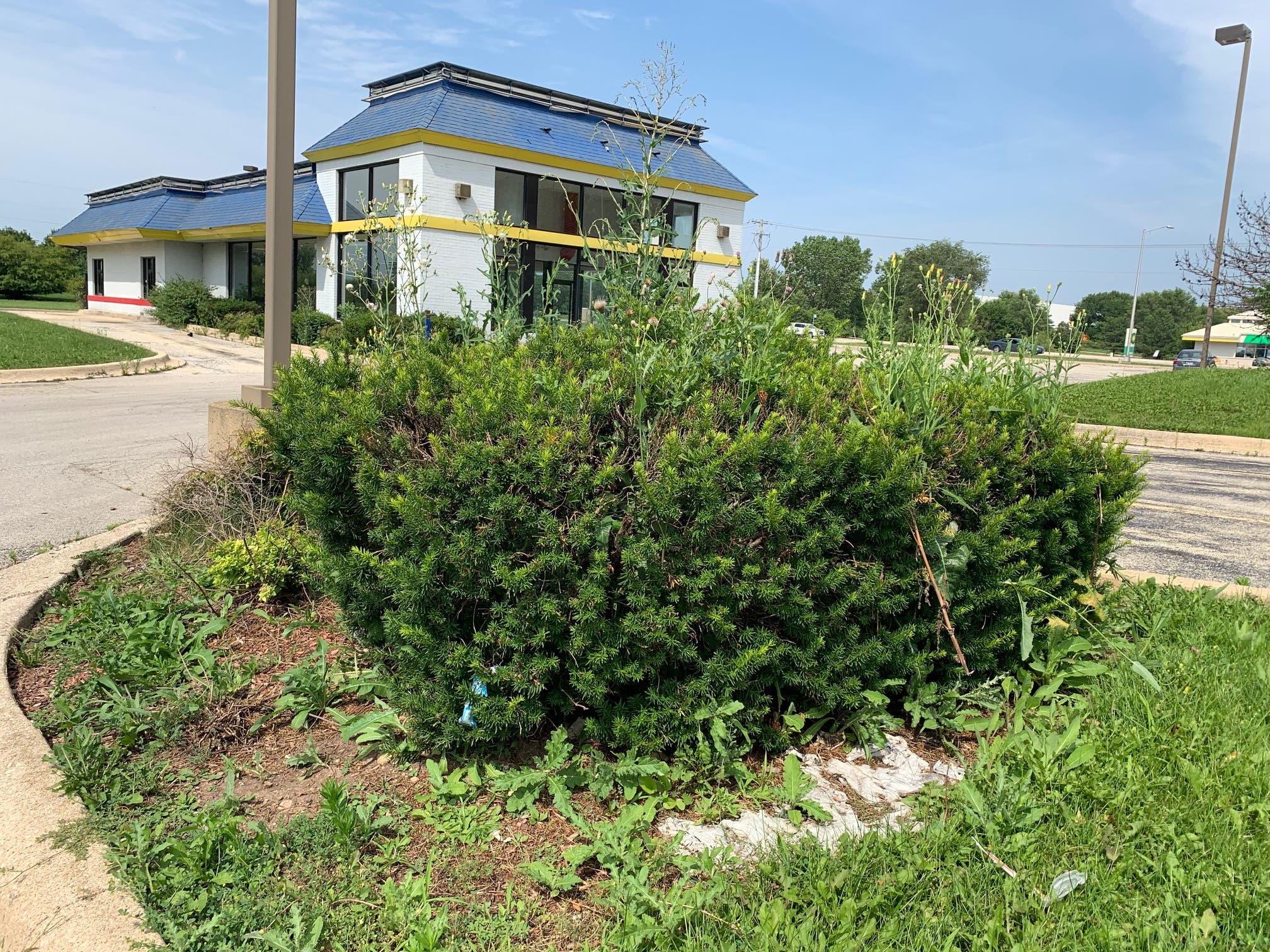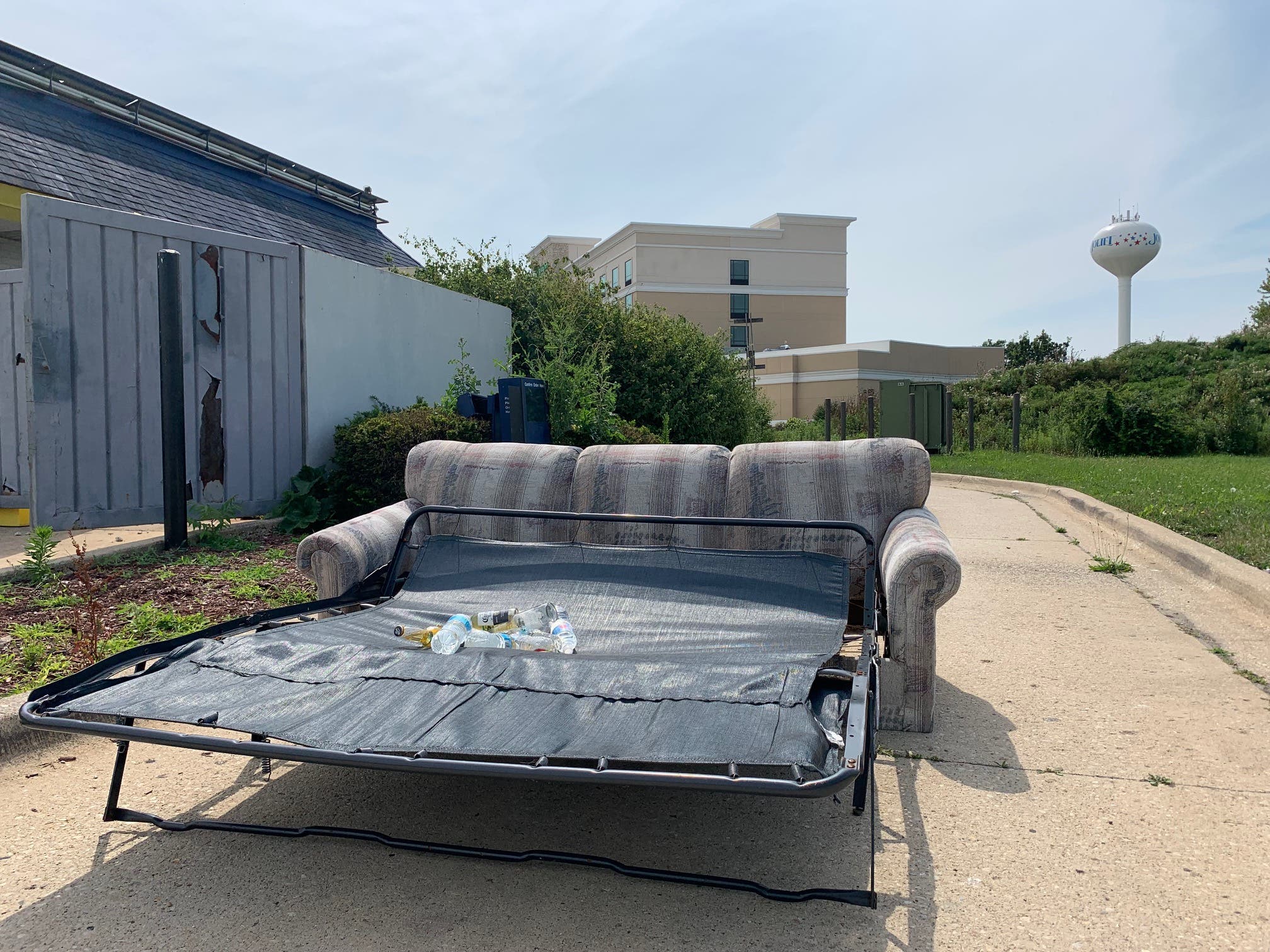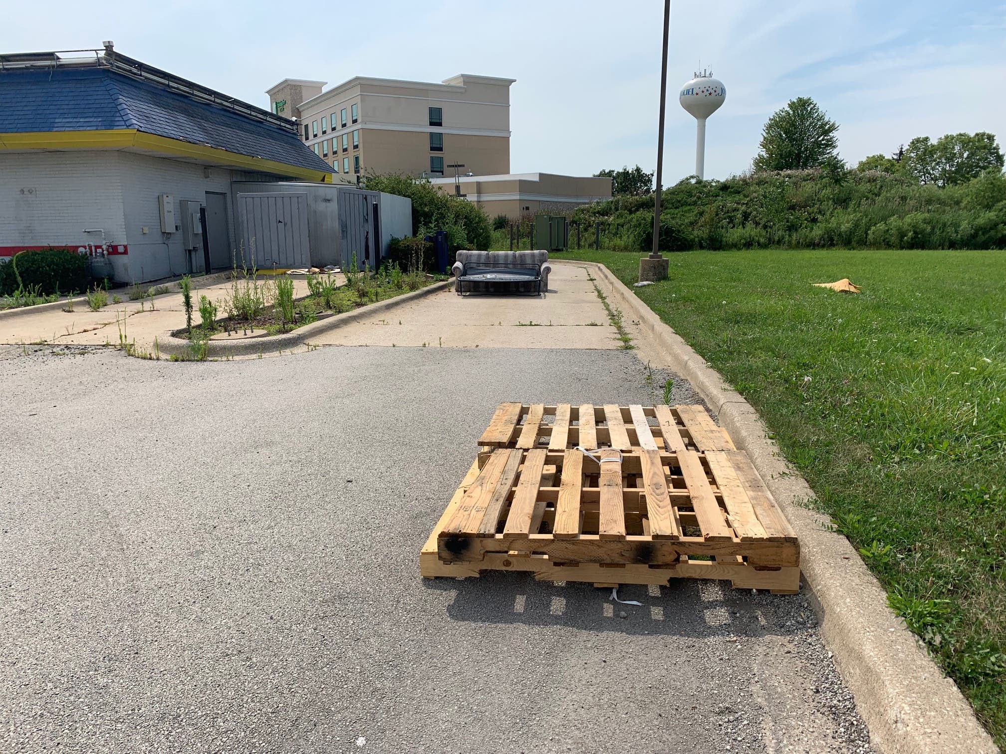 Joliet Patch visited the property Tuesday and found a large hide-a-bed sofa discarded near the old drive-thru lane. There were also several bottles of water and Corona beer that somebody left on the furniture. One of the light poles for the Burger King has been knocked down, and it's stretched across the grass along Houbolt Road.