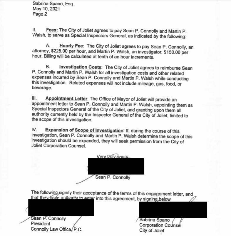 The next paragraph of the letter is called scope of the investigation. However, city officials redacted the next several lines pertaining to what Connolly and Walsh will investigate. Patch obtained details of the contract with the Law Offices of Sean Connolly through a Freedom of Information Act request.