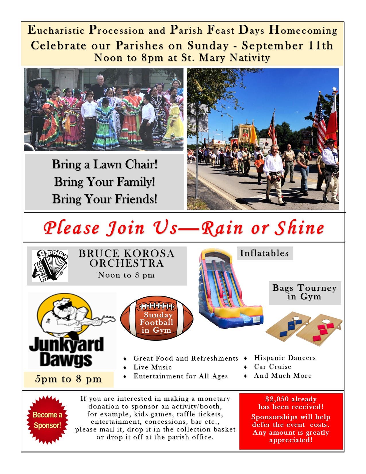 Celebrate our Parishes on Sunday - September 11th St. Mary Nativity 702 N Broadway, Joliet Noon to 8 pm. For info 815-726-4031