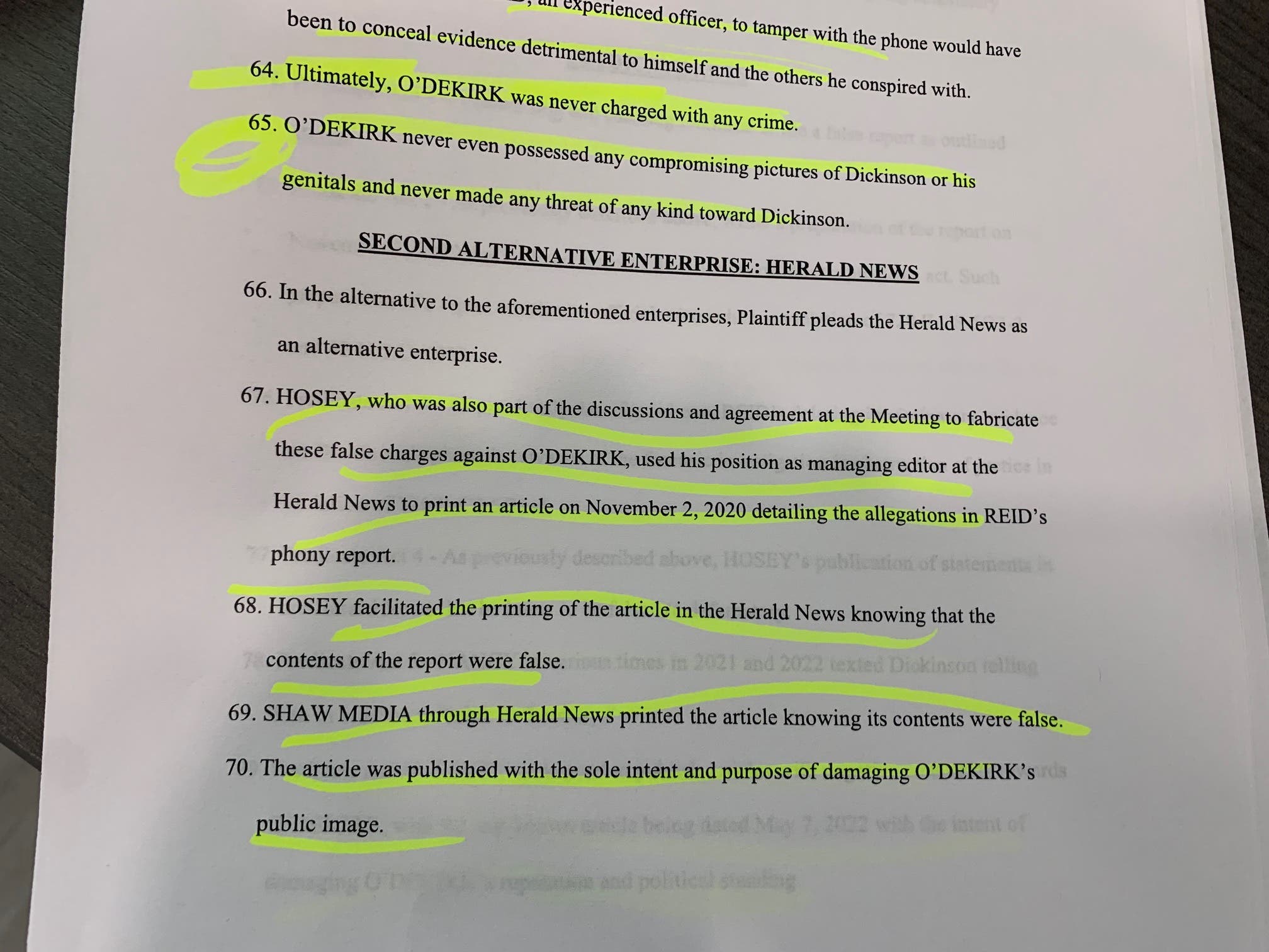 In that part of the lawsuit, the plaintiff's lawyers argue Hosey "used his position as managing editor at the Herald News to print an article on Nov. 2, 2020, detailing the allegations in Reid's phony report. Hosey facilitated the printing of the article in the Herald-News knowing that the contents of the report were false. Shaw Media, through Herald-News, printed the article knowing its contents were false. The article was published with the sole intent and purpose of damaging O'Dekirk's public image."