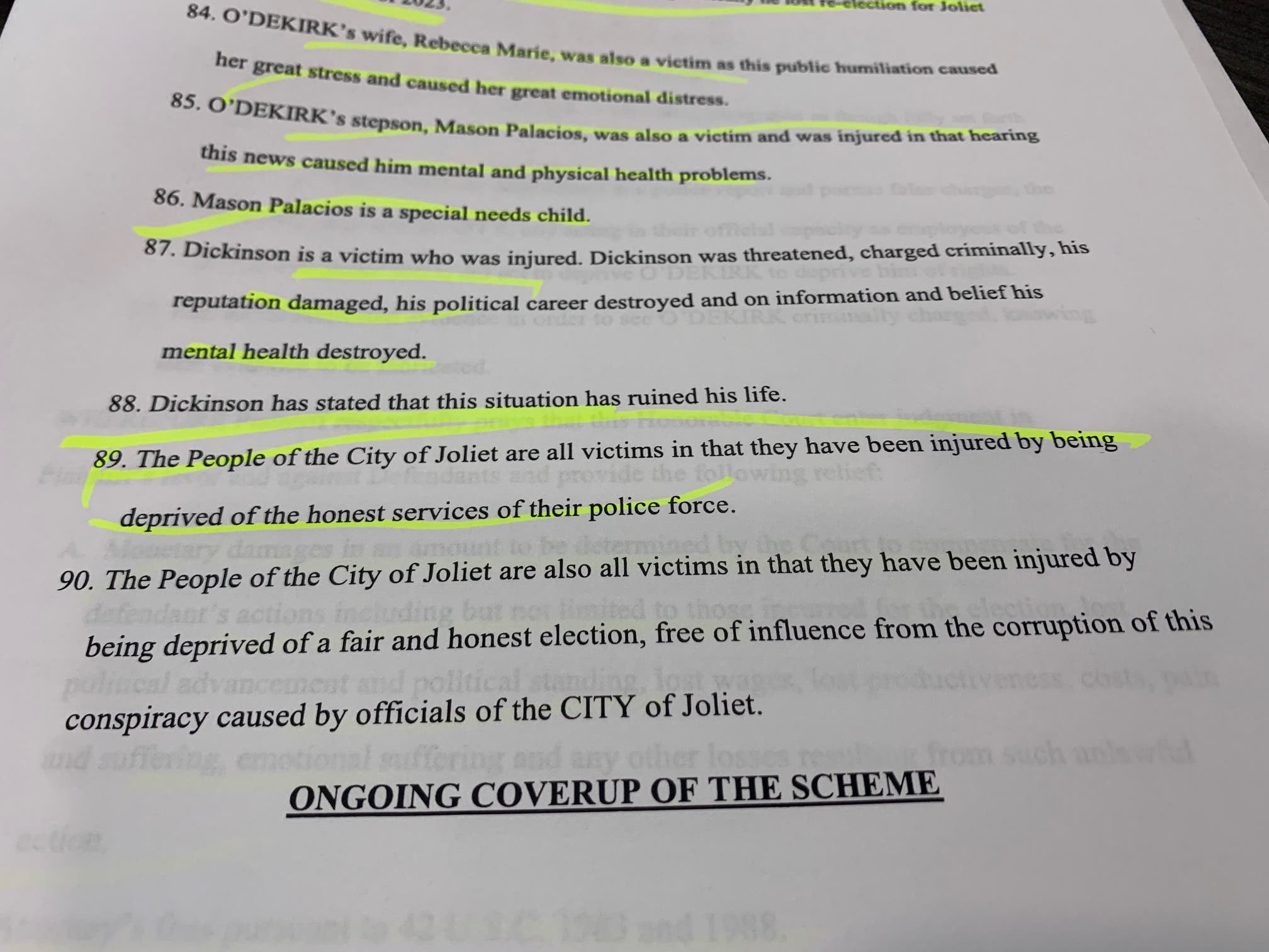 According to page 5 of the federal suit, "It was imperative for Roechner, Nancy, Reid, Mudron, McFarland and Hosey to damage the reputation of O'Dekirk because he was their political opponent in Joliet, and they saw him as a political obstacle to their career and political goals in Joliet."