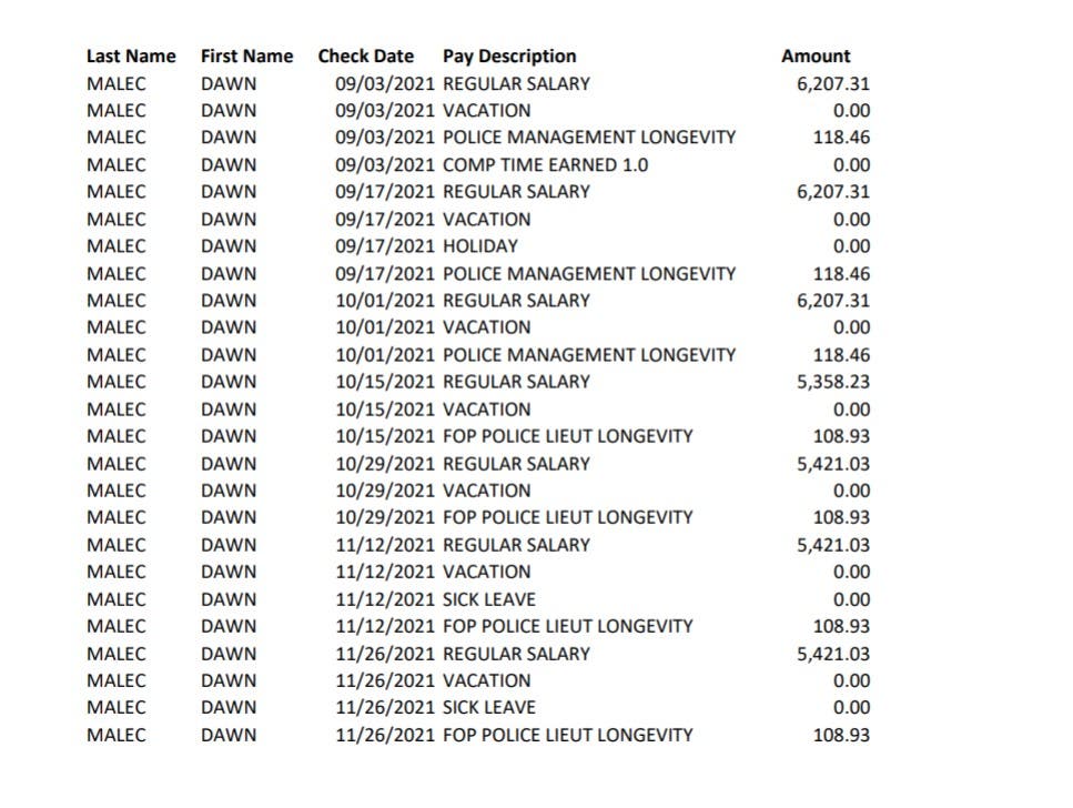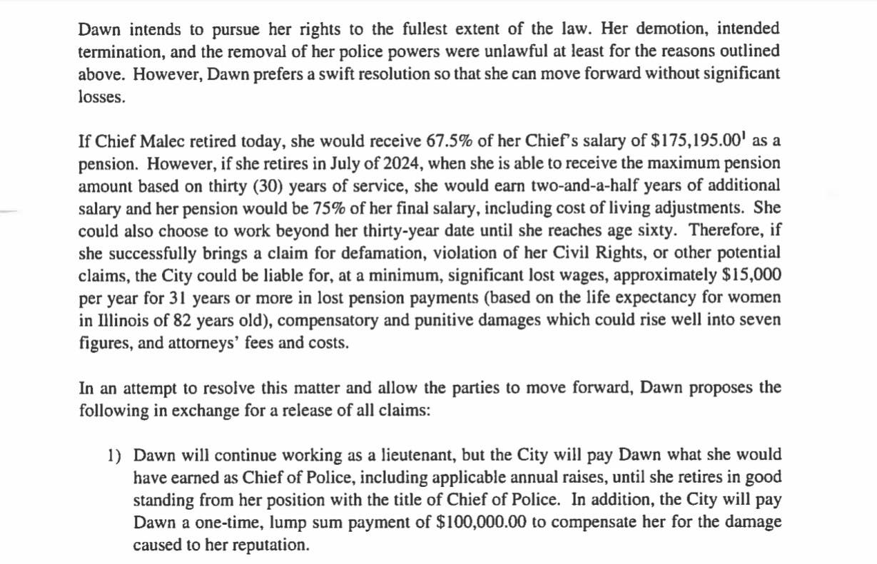 Malec's lawyer has also asked that Malec "be placed on paid leave (and) she will not be required to work at City Hall or any other place of work, but she will receive the full salary and benefits she would have received as chief of police" plus a "2 percent cost of living adjustment for one year past the date the agreement is signed."