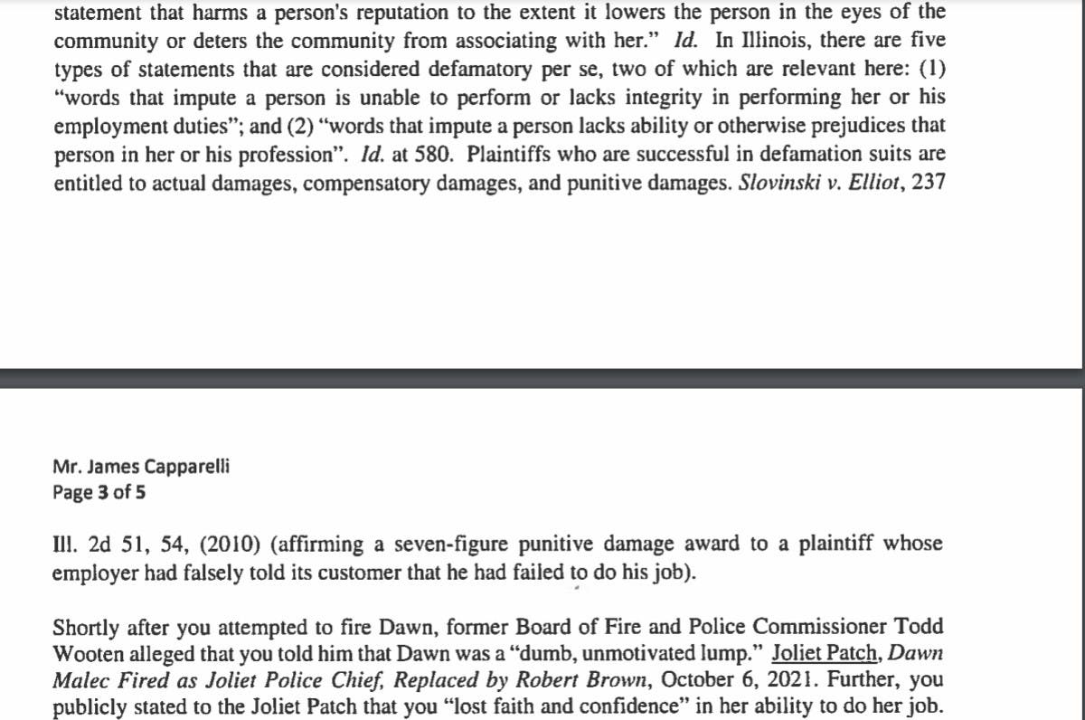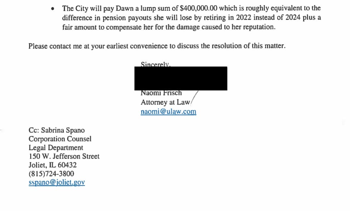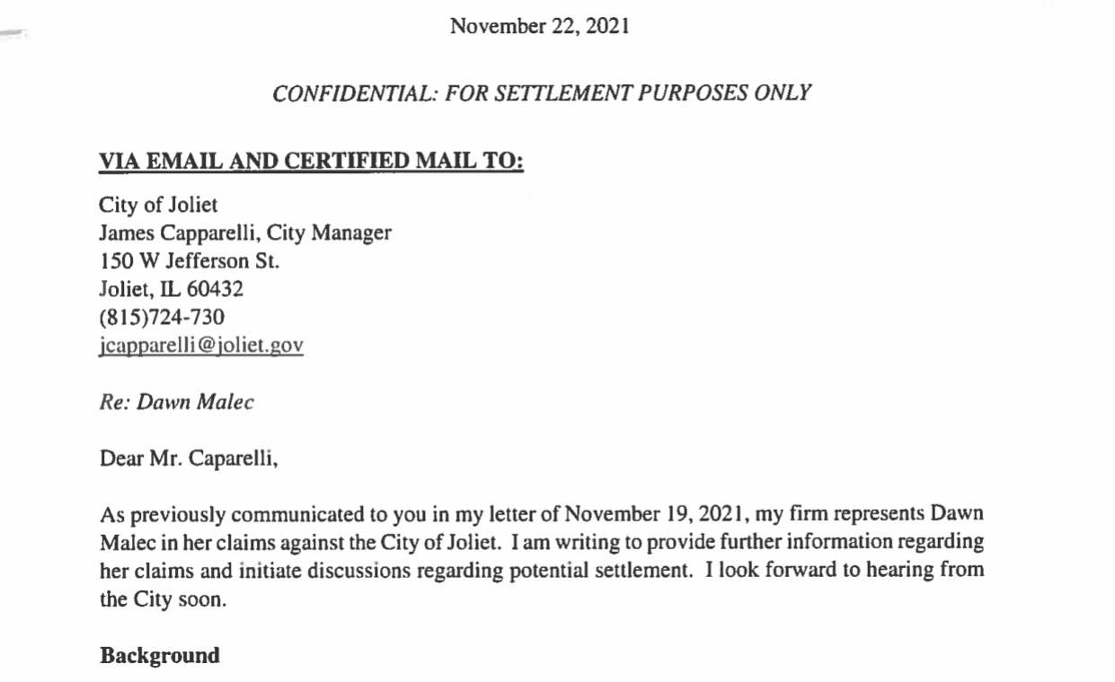 If Joliet does not agree to those demands in hopes of avoiding a lawsuit, Malec's lawyer proposed an alternative: Malec receive a $100,000 lump-sum payment "to compensate her for the damage caused to her reputation."