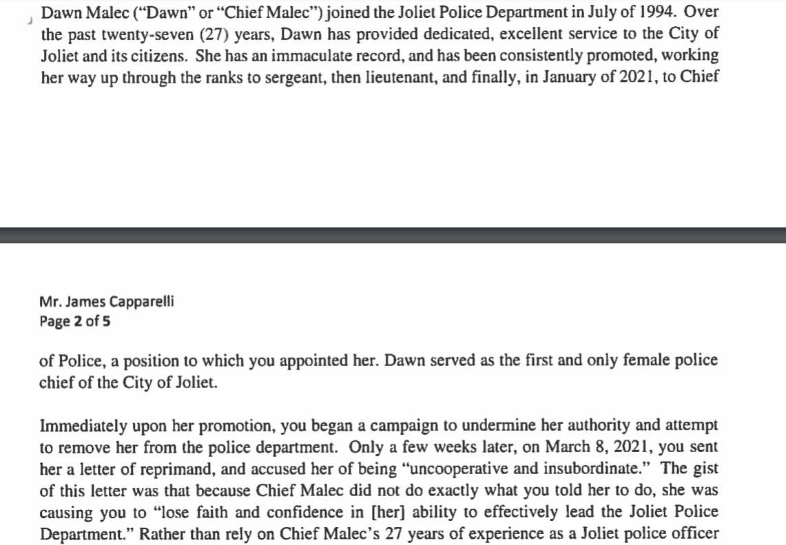 Additionally, while Malec remains on the police department as a lieutenant, Joliet would be obligated to pay Malec what she would have earned in a police chief's salary "until she retires in good standing from her position with the title of chief of police," according to the proposed settlement letter from Malec's lawyer.