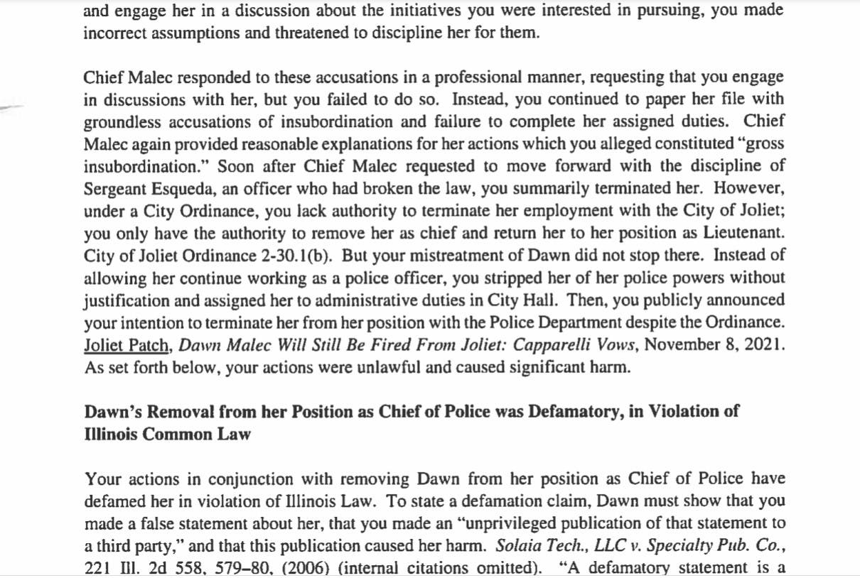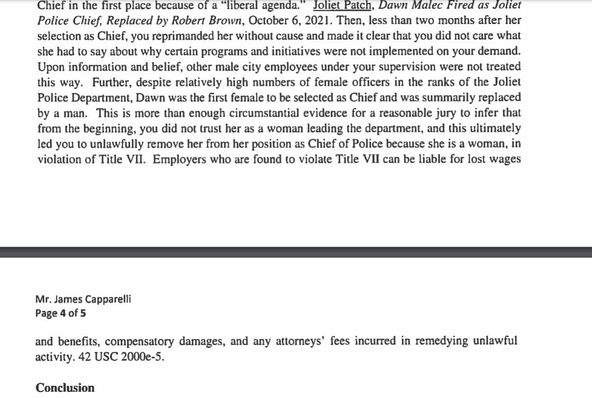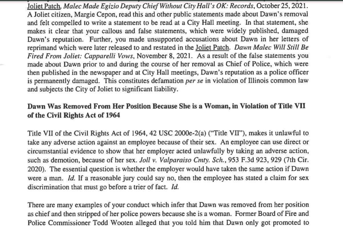 "There are many examples of your conduct which infer that Dawn was removed from her position as chief and then stripped of her police powers because she is a woman," Malec's lawyer wrote Capparelli.