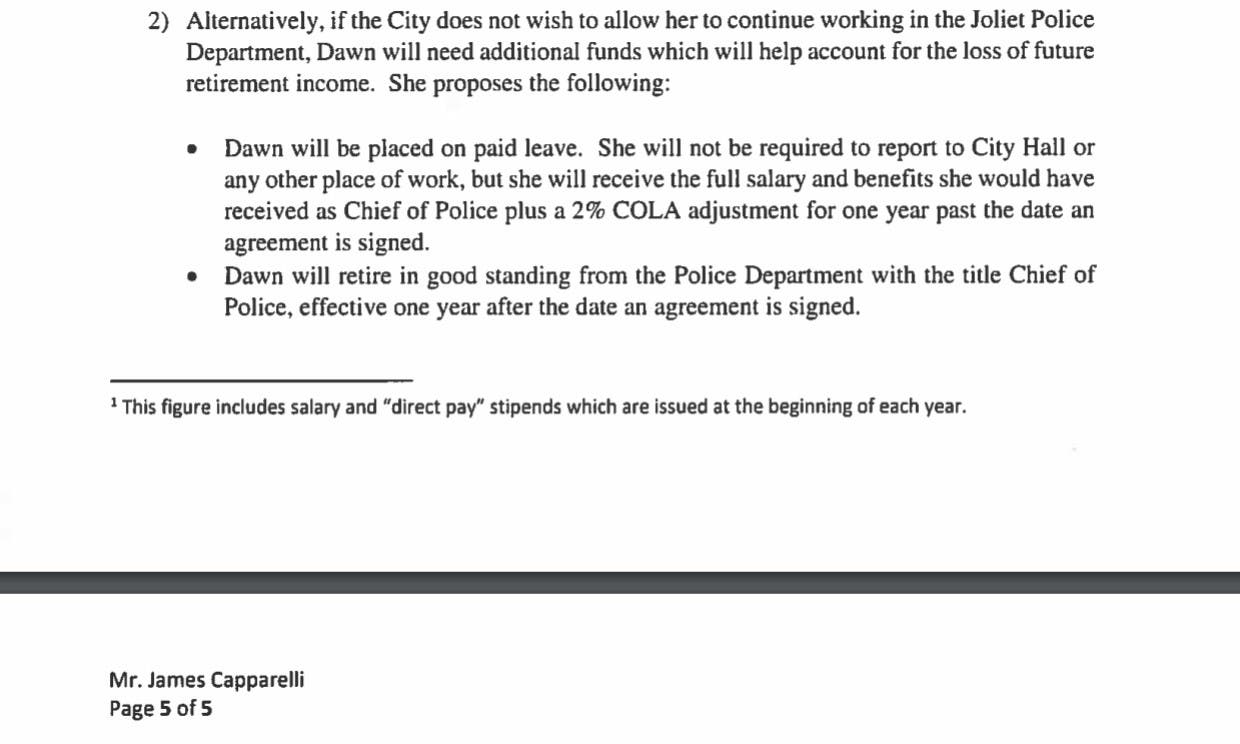 In addition to $400,000, Malec's proposed settlement also expected Joliet to let her retire with the job title of Joliet police chief "one year after the date the agreement is signed."