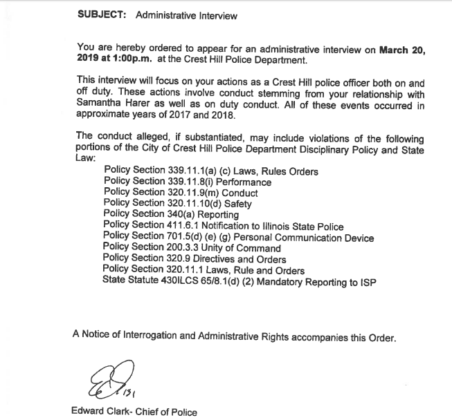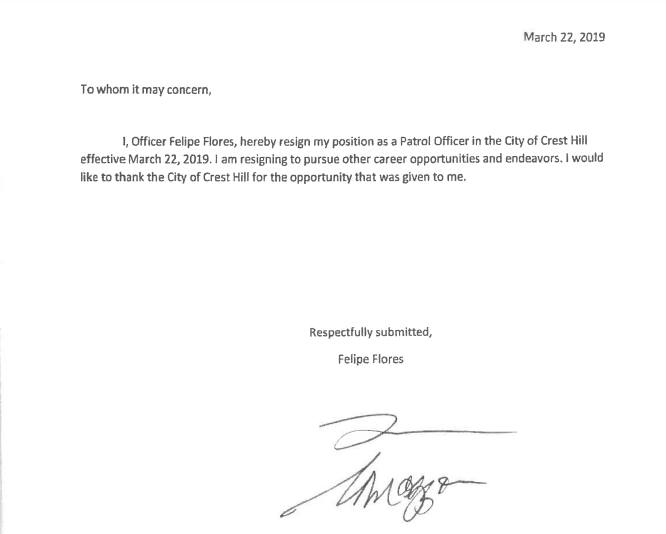 On March 14, 2019, Crest Hill Chief Ed Clark notified Flores in writing that a disciplinary hearing was set in six days related to multiple police department violations surrounding his relationship with Harer. Phil Flores did not show up for the hearing. Instead, two days later, he tendered him immediate resignation from the police force.