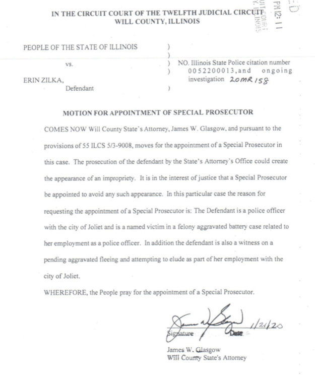 JOLIET, IL — State's Attorney Jim Glasgow received permission Tuesday from Will County Chief Judge Richard Schoenstedt for the appointment of a special prosecutor to handle the driving under the influence case against off-duty Joliet police officer Erin Zilka.