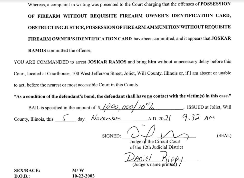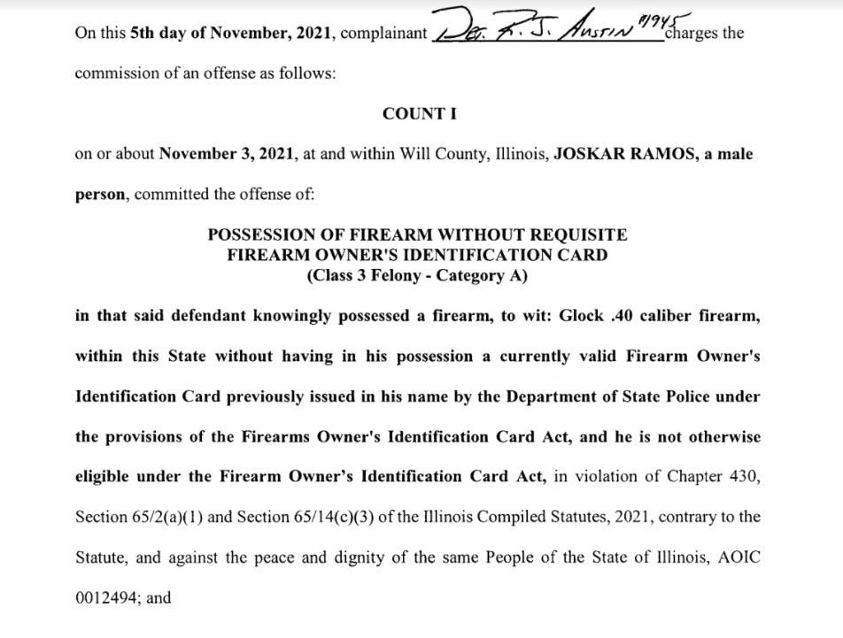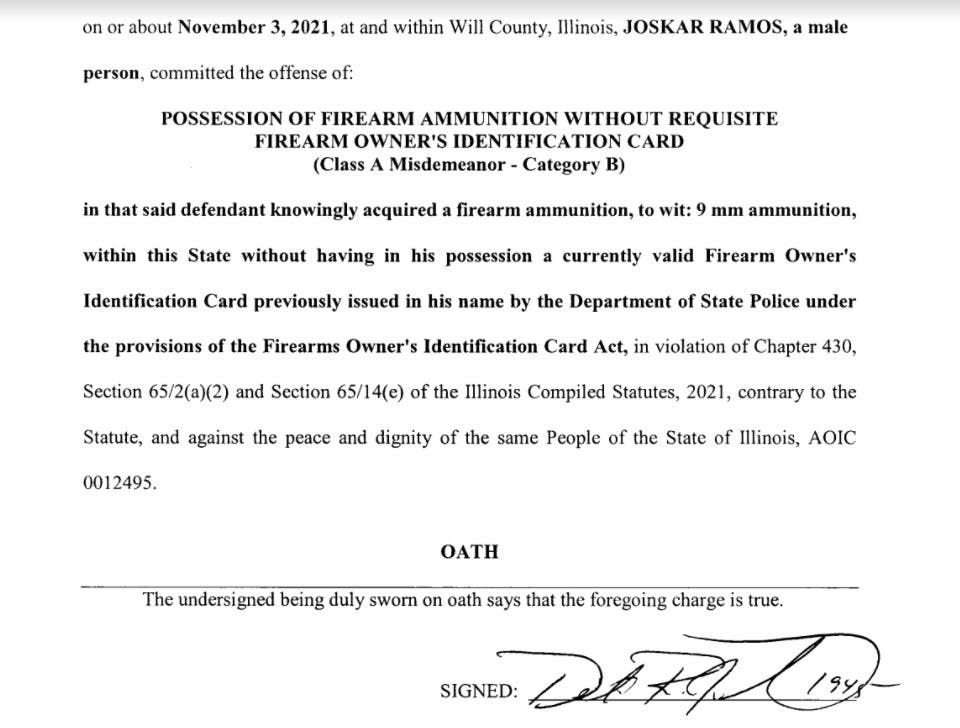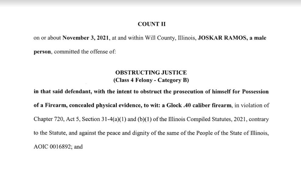 On Friday, the Will County State's Attorney's Office of Jim Glasgow charged Ramos with the following three crimes: possession of a gun without a valid Firearm Owners Identification card, obstructing justice and possession of gun ammunition without a valid Firearm Owners Identification card.