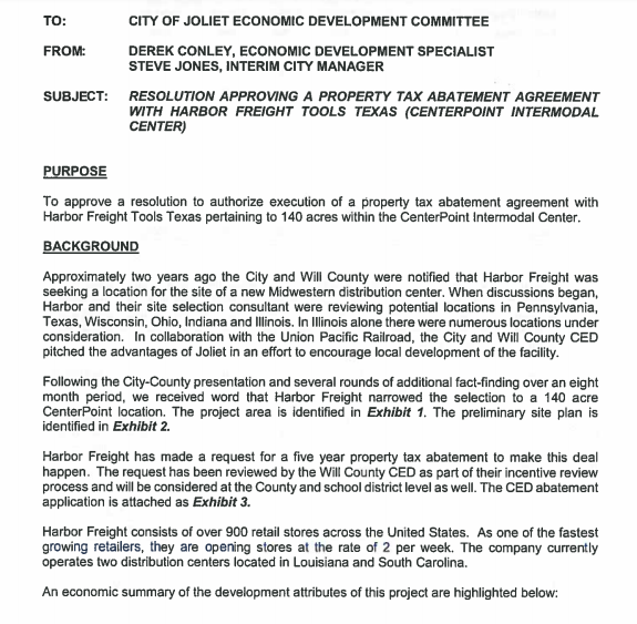 JOLIET, IL — The city of Joliet's Economic Development Office is recommending a five-year property tax abatement for Harbor Freight Tools Texas on a 140-acre parcel at the CenterPoint Intermodal Center. The proposed construction would become the largest building in Will County at more than 1.6 million square feet. The project is on the agenda for Tuesday's city of Joliet economic development council.