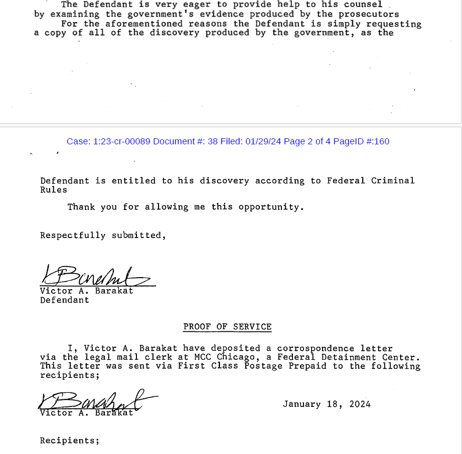 In late January, Barakat took it upon himself to mail a typed letter to U.S. District Judge John Tharp and the purpose of his letter was to complain about his lack of interaction with one of his criminal defense lawyers, Michael Ettinger of Palos Heights, whom he retained last April.