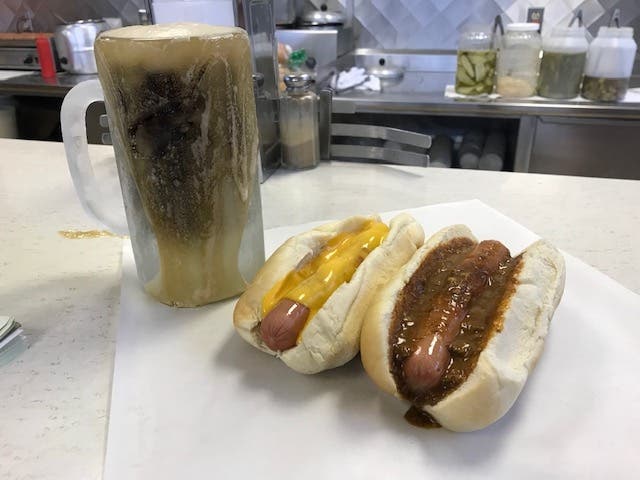 We sat in two stools at the front counter. We ordered our frosty root beer mugs and chowed down on some hot dogs.