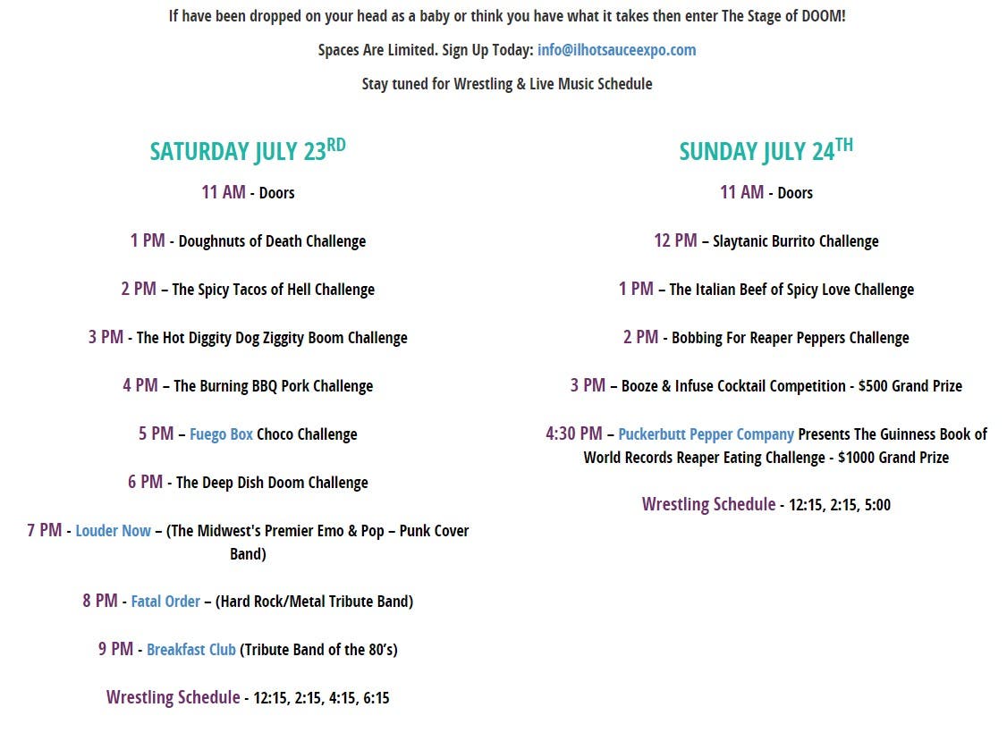 "The IL Hot Sauce Expo will feature the BEST Hot Sauce companies in the United States," the event's website proclaims. "You will get to meet the makers, Free Samples of hundreds of different hot sauces & you are able to buy whatever you desire. If you LOVE Hot Sauce then you are going to LOVE the 3rd Annual IL Hot Sauce Festival. This Is The Hottest Party In The State."