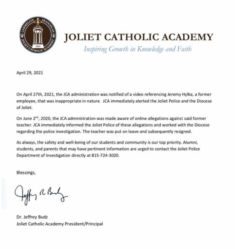 Joliet Catholic Academy issued a statement Thursday night — well after news of the arrest warrant was issued — announcing that it had gone to the Joliet Police Department and the Diocese of Joliet last summer in regard to "online allegations" against Hylka.