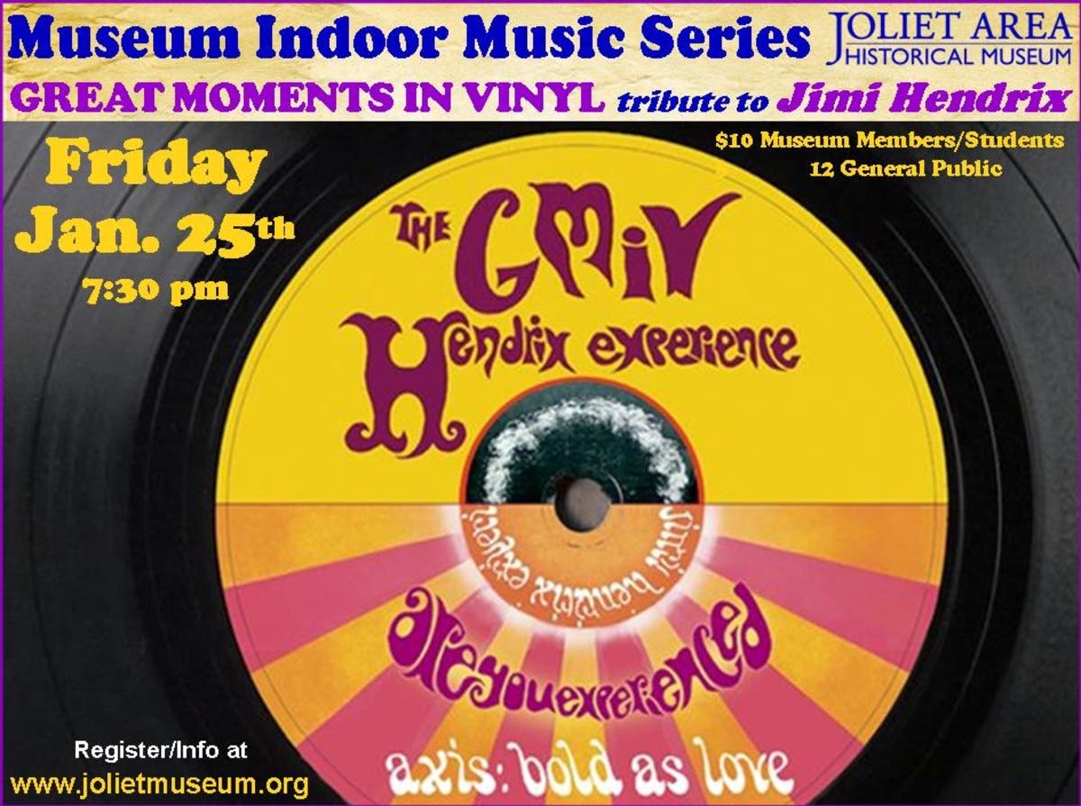 Great Moments In Vinyl plays tribute to Jimi Hendrix - live at the Joliet Area Historical Museum on Friday, January 25th at 7:30pm