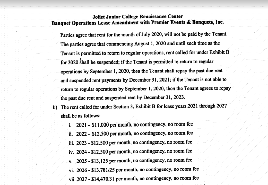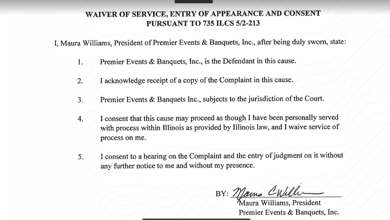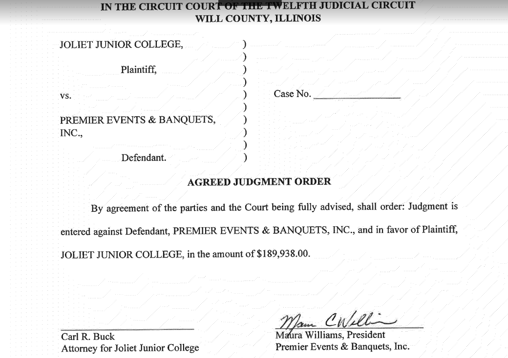 According to records at the Will County Courthouse, the lawsuit defendant, Maura Williams, has signed her name on court documents presented by the plaintiff's lawyers agreeing that a judgment on behalf of Joliet Junior College be entered against her corporation, Premier Events & Banquets, in the amount of $189,938.