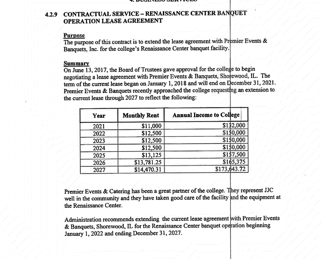 Attorney Carl Buck of Joliet law firm Rathbun, Cservenyak & Kozol contends that the Williams failed to pay about $190,000 in rent and related service as part of their multi-year lease agreement with Joliet Junior College for use of the Renaissance Center in downtown Joliet.