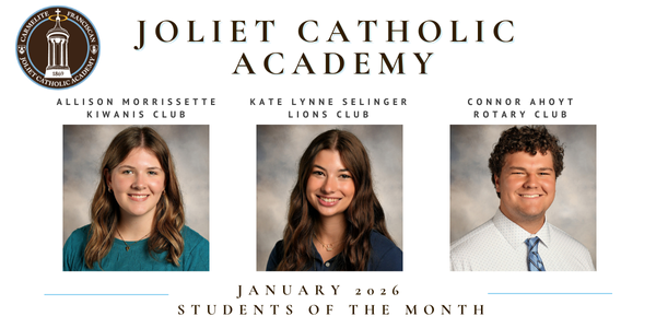 JOLIET, IL — Joliet Catholic Academy President/Principal Dr. Jeffrey Budz is pleased to announce the January Students of the Month: Allison Morrissette (Kiwanis Club), Kate Lynne Selinger (Lions Club), and Connor Ahoyt (Rotary Club). JCA is proud of the success these students have exhibited in both the classroom and in the community.