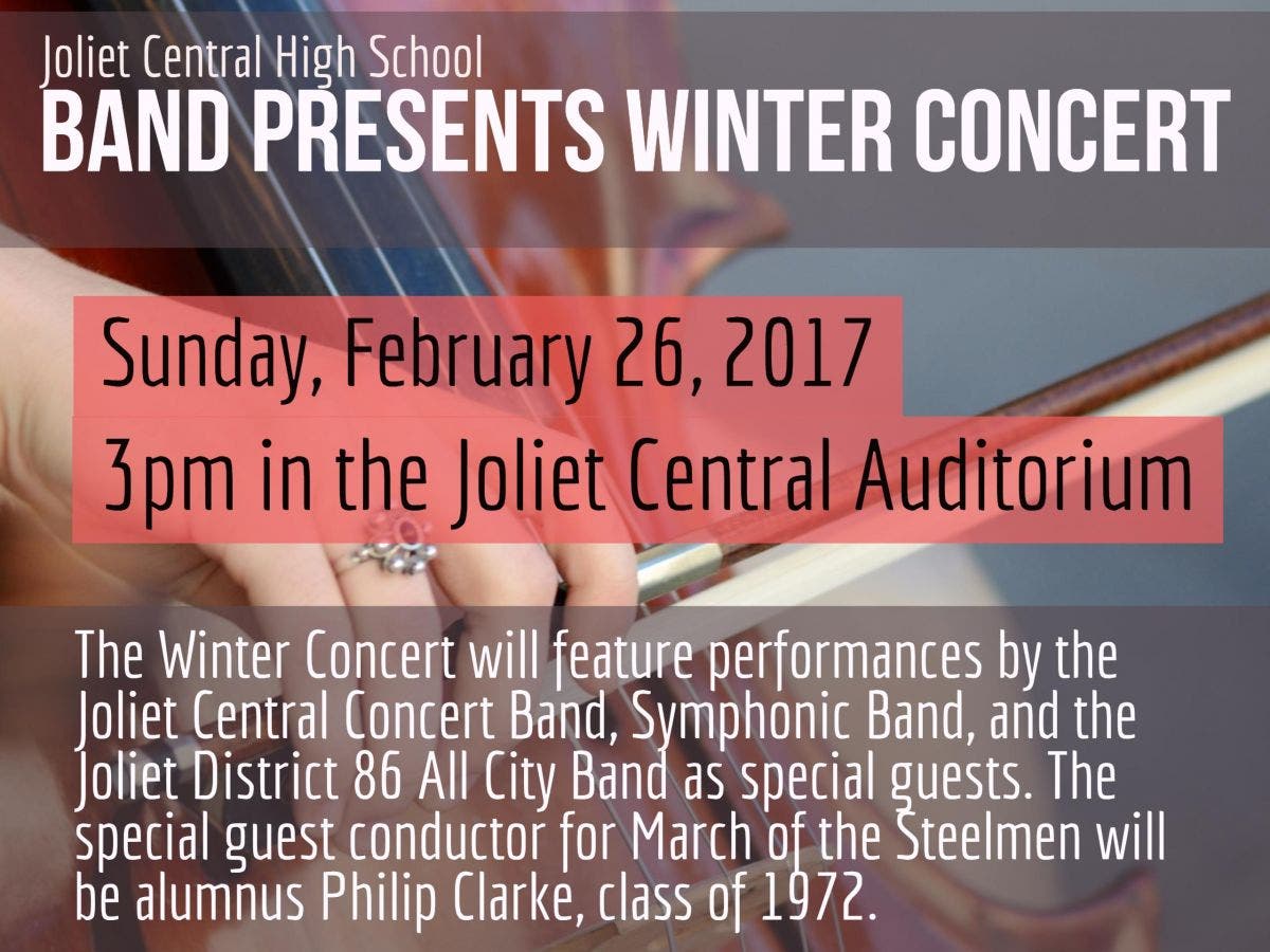 The concert will feature performances by the Joliet Central Concert Band, Symphonic Band, & the Joliet District 86 All City Band as guests