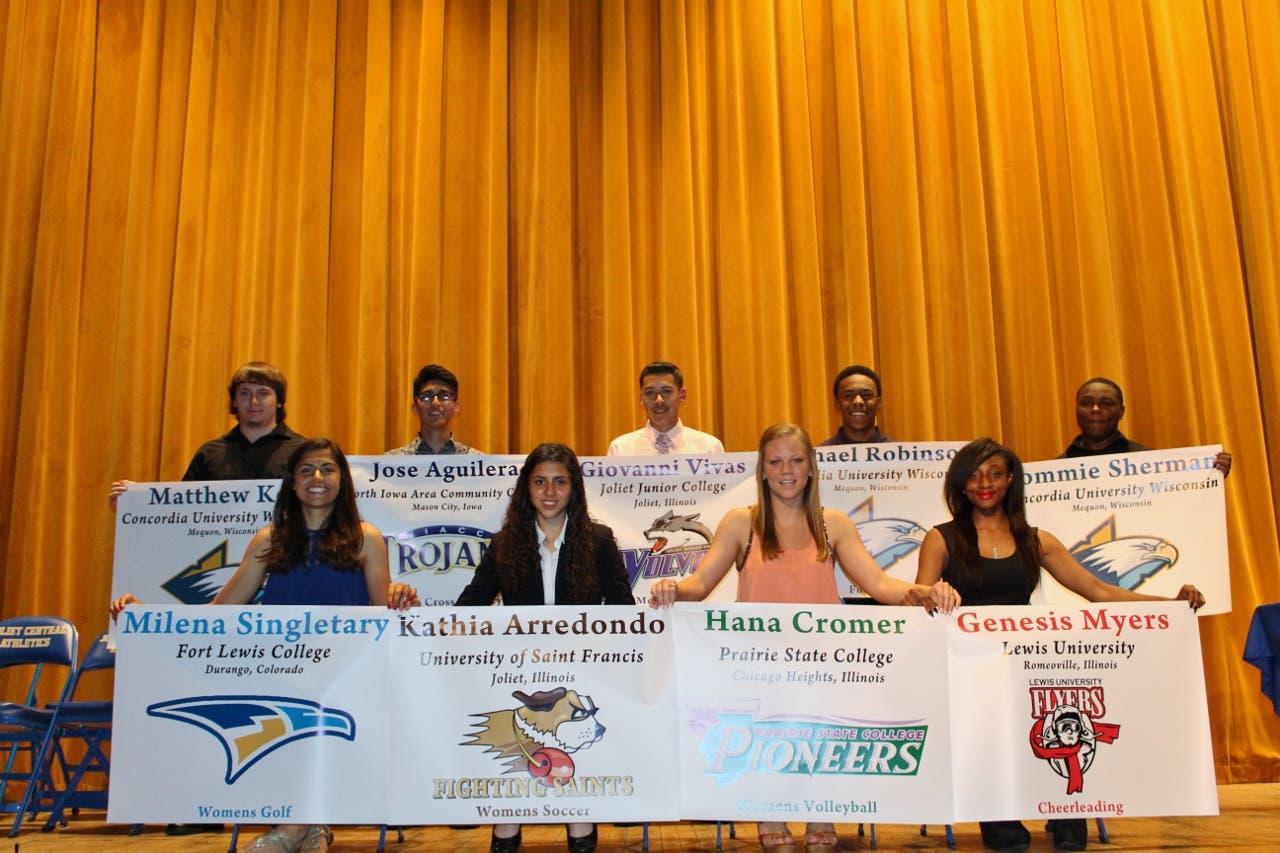 Students who signed letters of intent at the ceremony include: Giovanni Vivas, Joliet Junior College- Mens Soccer; Hana Cromer, Prairie State College-Womens Volleyball; Genesis Meyers, Lewis University- Cheerleading; Jose Aguilera, North Iowa Area Community College- Mens Cross Country; Kathia Arredondo, University of St. Francis-Womens Soccer; Milena Singletary, Fort Lewis College- Womens Golf; Tommie Sherman, Concordia University Wisconsin- Football; Michael Robinson, Concordia University Wisconsin- Football; and Matthew Key, Concordia University Wisconsin- Football.