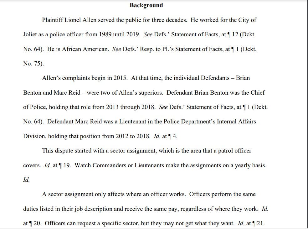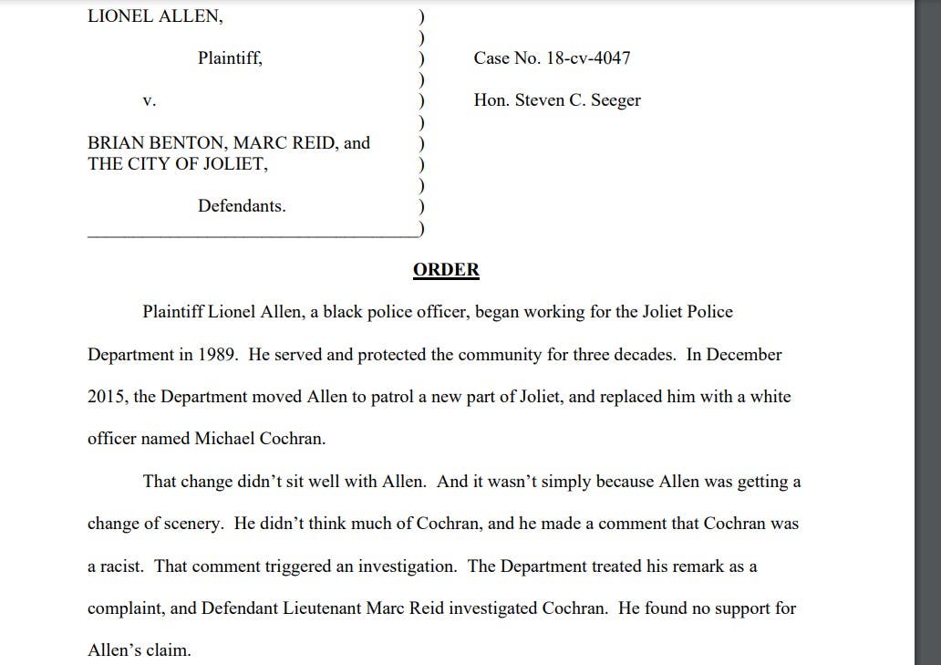 In 2018, while still on the Joliet Police Department, Allen filed his federal lawsuit against the Joliet Police Department, Chief Benton and Lt. Marc Reid, who oversaw internal affairs at the time.